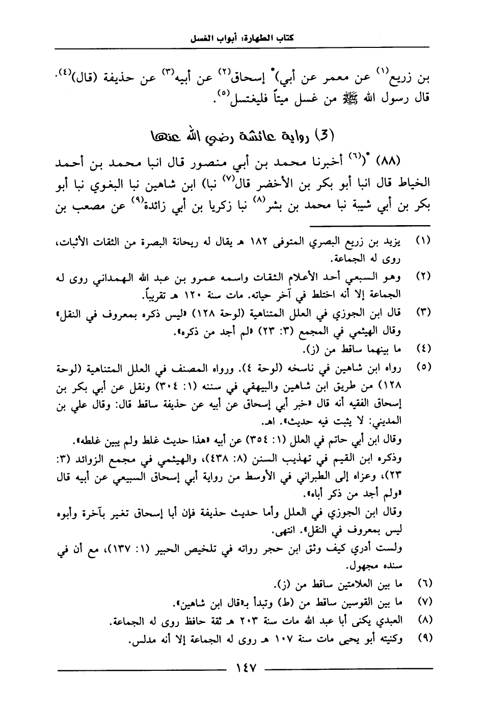 بْنُ زَرِيعٍ، عَنْ مَعْمَرٍ، عَنْ أَبِي إِسْحَاقَ، عَنْ أَبِيهِ، عَنْ حُذَيْفَةَ، قَالَ: قَالَ رَسُولُ اللَّهِ صَلَّى اللَّهُ عَلَيْهِ وَسَلَّمَ: «مَنْ غَسَّلَ مَيِّتًا، فَلْيَتْغَسِلْ»
