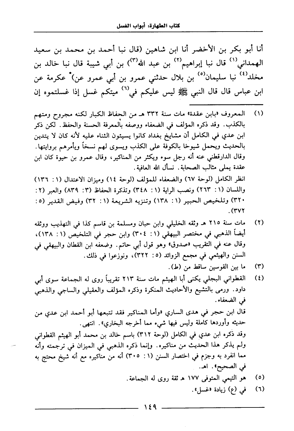 أَنَا أَبُو بَكْرِ بْنِ الْأَخْضَرِ، أَنَا ابْنُ شَاهِينَ، قَالَ: نَبَا أَحْمَدُ بْنُ مُحَمَّدِ بْنِ سَعِيدٍ الْهَمْدَانِيُّ، قَالَ: نَبَا إِبْرَاهِيمُ بْنُ عَبْدِ اللَّهِ بْنِ أَبِي شَيْبَةَ، قَالَ: نَبَا خَالِدُ بْنُ مِخْلَدٍ، نَبَا سُلَيْمَانُ بْنُ بِلَالٍ، حَدَّثَنِي عَمْرُو بْنُ أَبِي عَمْرٍو، عَنْ عِكْرِمَةَ، عَنِ ابْنِ عَبَّاسٍ، قَالَ: قَالَ النَّبِيُّ صَلَّى اللَّهُ عَلَيْهِ وَسَلَّمَ: «لَيْسَ عَلَيْكُمْ فِي مَيِّتِكُمْ غُسْلٌ إِذَا غَسَّلْتُمُوهُ، إِنَّ