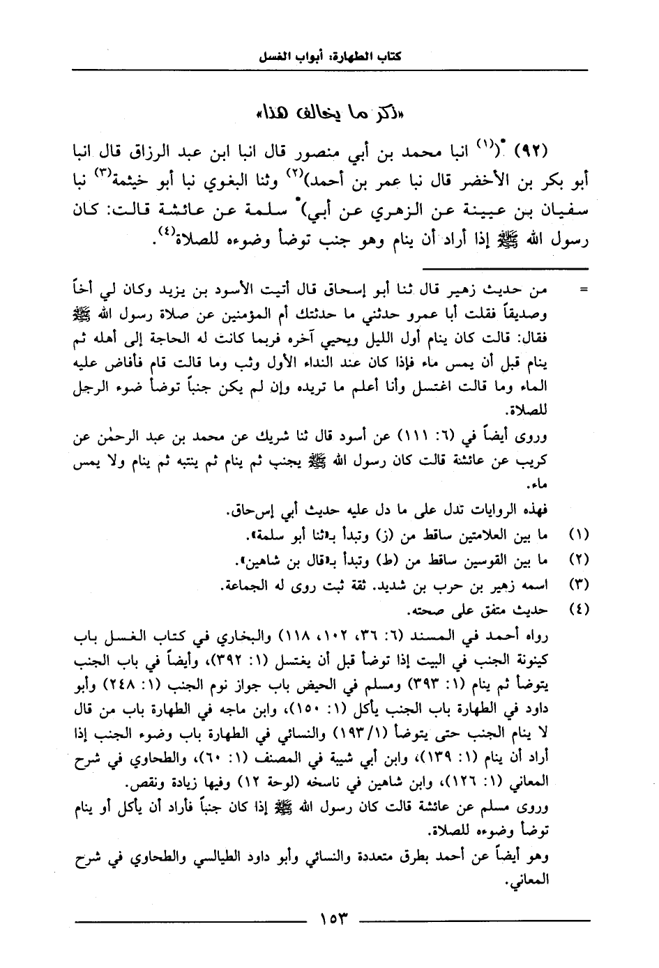 92 - أَنْبَأَ مُحَمَّدُ بْنُ أَبِي مَنْصُورٍ، قَالَ: أَنْبَأَ ابْنُ عَبْدِ الرَّزَّاقِ، قَالَ: أَنْبَأَ أَبُو بَكْرِ بْنُ الْأَخْضَرِ، قَالَ: نَبَا عُمَرُ بْنُ أَحْمَدَ، وَثَنَا الْبَغَوِيُّ، نَبَا أَبُو خَيْثَمَةَ، نَبَا سُفْيَانُ بْنُ عُيَيْنَةَ، عَنِ الزُّهْرِيِّ، عَنْ أَبِي سَلَمَةَ، عَنْ عَائِشَةَ، قَالَتْ: «كَانَ رَسُولُ اللَّهِ صَلَّى اللَّهُ عَلَيْهِ وَسَلَّمَ إِذَا أَرَادَ أَنْ يَنَامَ وَهُوَ جُنُبٌ تَوَضَّأَ وُضُوءَهُ لِلصَّلَاةِ» .