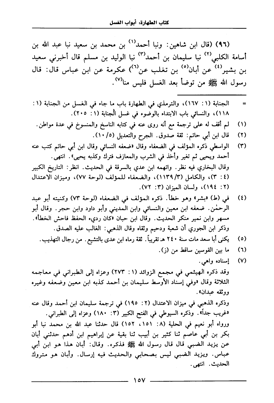 96 - قَالَ ابْنُ شَاهِينَ: وَنَبَا أَحْمَدُ بْنُ مُحَمَّدِ بْنِ سَعِيدٍ، نَبَا عَبْدُ اللَّهِ بْنُ أُسَامَةَ الْكَلْبِيُّ، نَبَا سُلَيْمَانُ بْنُ أَحْمَدَ، نَبَا الْوَلِيدُ بْنُ مُسَلْمٍ، قَالَ: أَخْبَرَنِي سَعِيدُ بْنُ بَشِيرٍ، عَنْ أَبَانِ بْنِ تَغْلَبَ، عَنْ عِكْرِمَةَ، عَنِ ابْنِ عَبَّاسٍ، قَالَ: قَالَ رَسُولُ اللَّهِ صَلَّى اللَّهُ عَلَيْهِ وَسَلَّمَ: «مَنْ تَوَضَّأْ بَعْدَ الْغُسْلِ، فَلَيْسَ مِنَّا» .