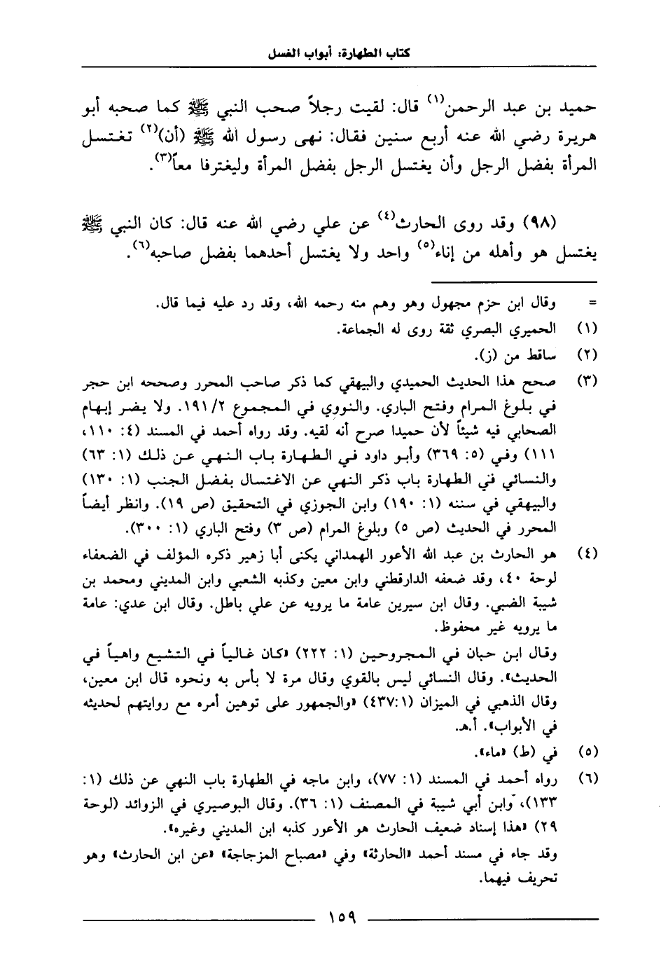 98 - وَقَدْ رَوَى الْحَارِثُ، عَنْ عَلِيٍّ، رَضِيَ اللَّهُ عَنْهُ، قَالَ: «كَانَ النَّبِيُّ صَلَّى اللَّهُ عَلَيْهِ وَسَلَّمَ يَغْتَسِلُ هُوَ وَأَهْلُهُ مِنْ إِنَاءٍ وَاحِدٍ، وَلَا يَغْتَسِلُ أَحَدُهُمَا بِفَضْلِ صَاحِبِهِ»