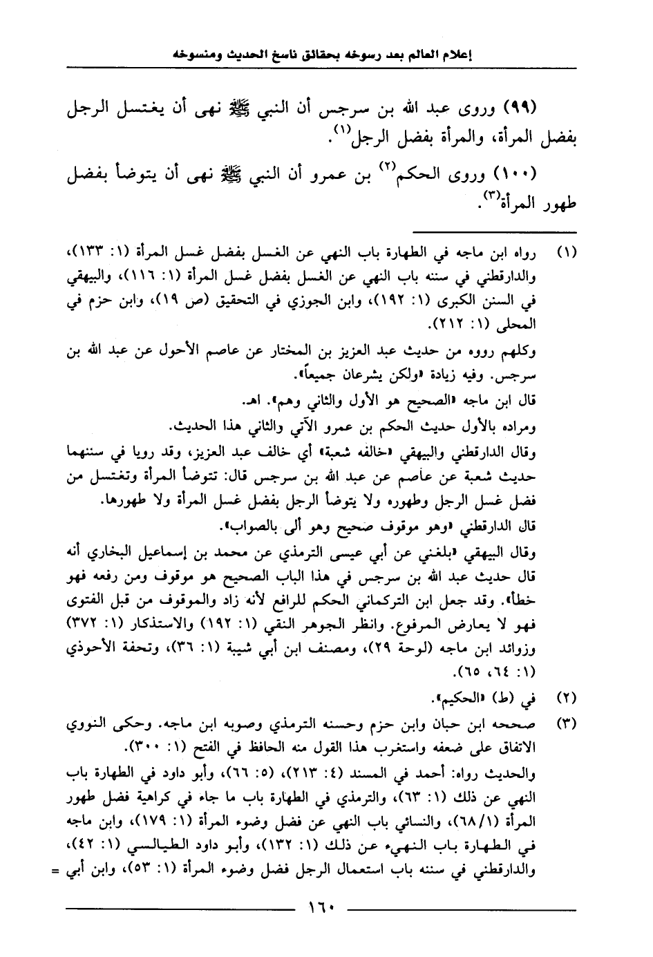 98 99 - وَرَوَى عَبْدُ اللَّهِ بْنُ سَرْجَسٍ: أَنَّ النَّبِيَّ صَلَّى اللَّهُ عَلَيْهِ وَسَلَّمَ «نَهَى أَنْ يَغْتَسِلَ الرَّجُلُ بِفَضْلِ الْمَرْأَةِ، وَالْمَرْأَةُ بِفَضْلِ الرَّجُلِ» 99 100 - وَرَوَى الْحَكَمُ بْنُ عَمْرٍو: أَنَّ النَّبِيَّ صَلَّى اللَّهُ عَلَيْهِ وَسَلَّمَ «نَهَى أَنْ يَتَوَضَّأَ بِفَضْلِ طَهُورِ الْمَرْأَةِ»