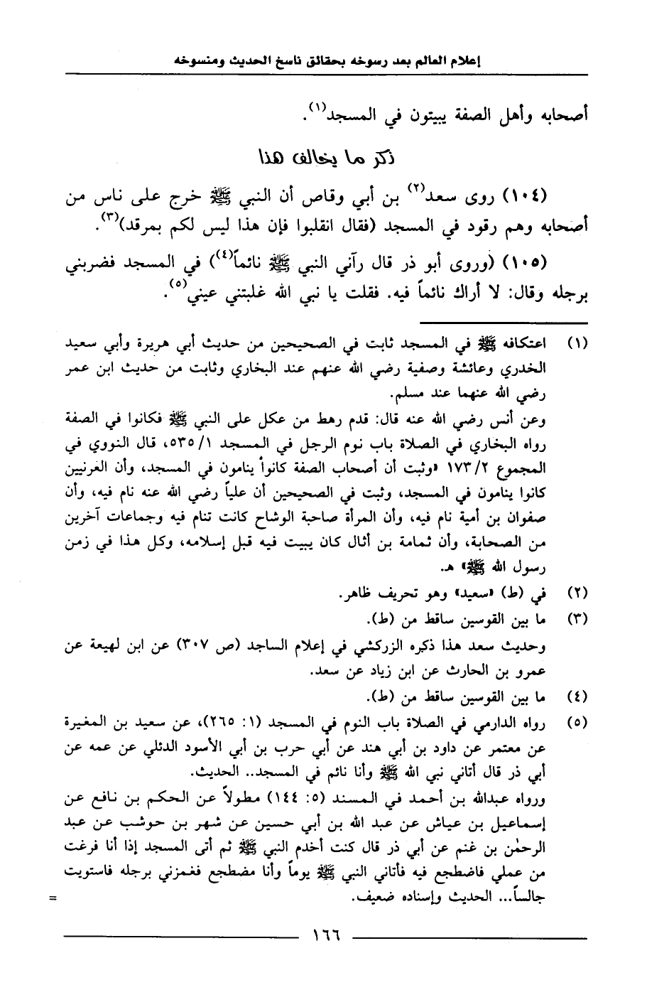 104 - رَوَى سَعْدُ بْنُ أَبِي وَقَّاصٍ، أَنَّ النَّبِيَّ صَلَّى اللَّهُ عَلَيْهِ وَسَلَّمَ: خَرَجَ عَلَى نَاسٍ مِنْ أَصْحَابِهِ وَهُمْ رُقُودٌ فِي الْمَسْجِدِ، فَقَالَ: «انْقَلِبُوا، فَإِنَّ هَذَا لَيْسَ لَكُمْ بِمَرْقَدٍ» 104 105 - وَرَوَى أَبُو ذَرٍّ، قَالَ: رَآنِي النَّبِيُّ صَلَّى اللَّهُ عَلَيْهِ وَسَلَّمَ نَائِمًا فِي الْمَسْجِدِ، فَضَرَبَنِي بِرِجْلِهِ، وَقَالَ: «لَا أَرَاكَ نَائِمًا فِيهِ» .