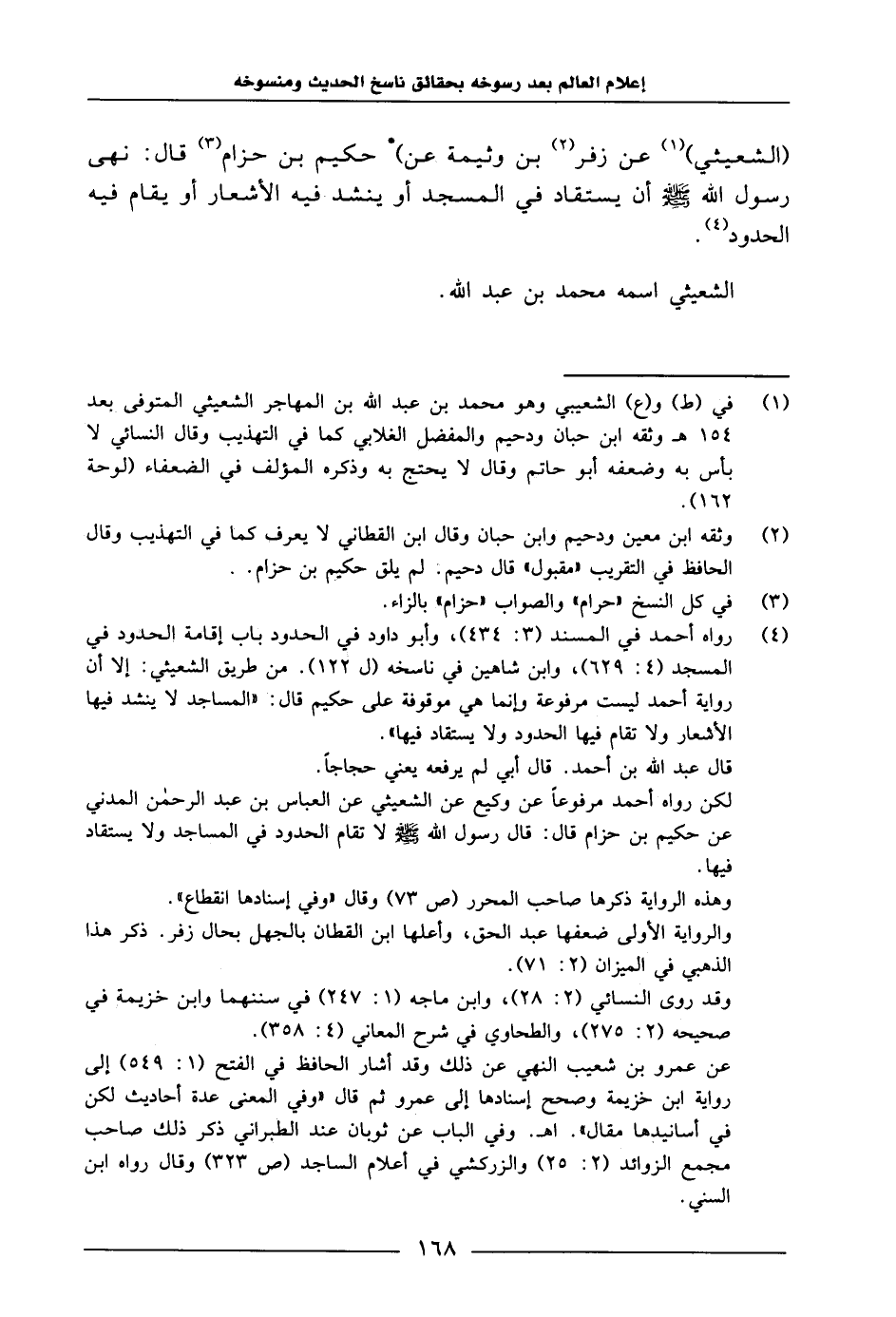 الشَّعِيثِيُّ، عَنْ زُفَرَ بْنِ وَثِيمَةَ، عَنْ حَكِيمِ بْنِ حِزَامٍ، قَالَ: «نَهَى رَسُولُ اللَّهِ صَلَّى اللَّهُ عَلَيْهِ وَسَلَّمَ أَنْ يُسْتَقَادَ فِي الْمَسْجِدِ، أَوْ يُنْشَدَ فِيهِ الْأَشْعَارُ، أَوْ يُقَامُ فِيهِ الْحُدُودُ» .