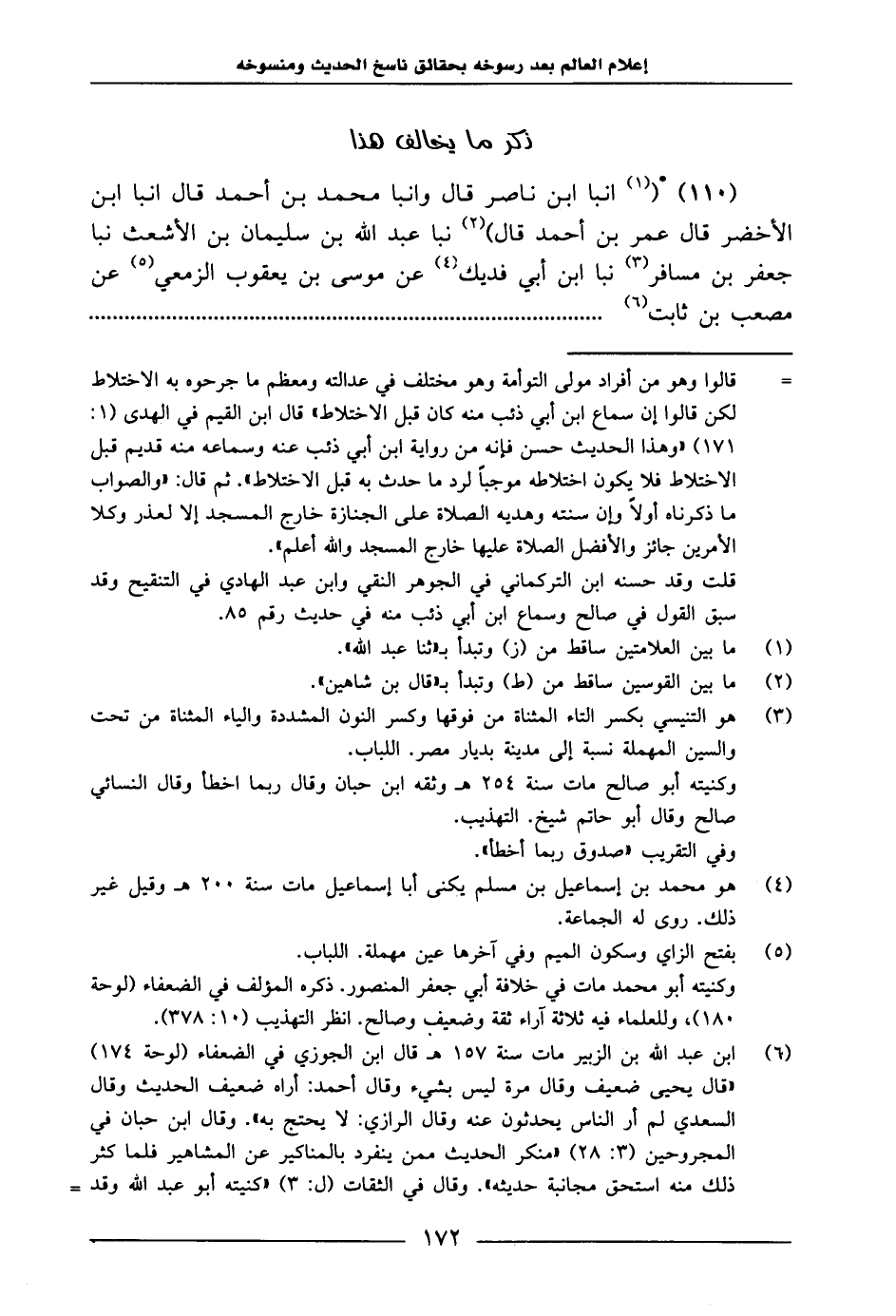 110 - أَنْبَأَ ابْنُ نَاصِرٍ، قَالَ: وَأَنْبَا مُحَمَّدُ بْنُ أَحْمَدَ، قَالَ: أَنْبَأَ ابْنُ الْأَخْضَرِ، قَالَ: عُمَرُ بْنُ أَحْمَدَ، قَالَ: نَبَا عَبْدُ اللَّهِ بْنُ سُلَيْمَانَ بْنِ الْأَشْعَثِ، نَبَا جَعْفَرُ بْنُ مُسَافِرٍ، نَبَا ابْنُ أَبِي فُدَيْكٍ، عَنْ مُوسَى بْنِ يَعْقُوبَ الزَّمْعِيِّ، عَنْ مُصْعَبِ بْنِ ثَابِتٍ،