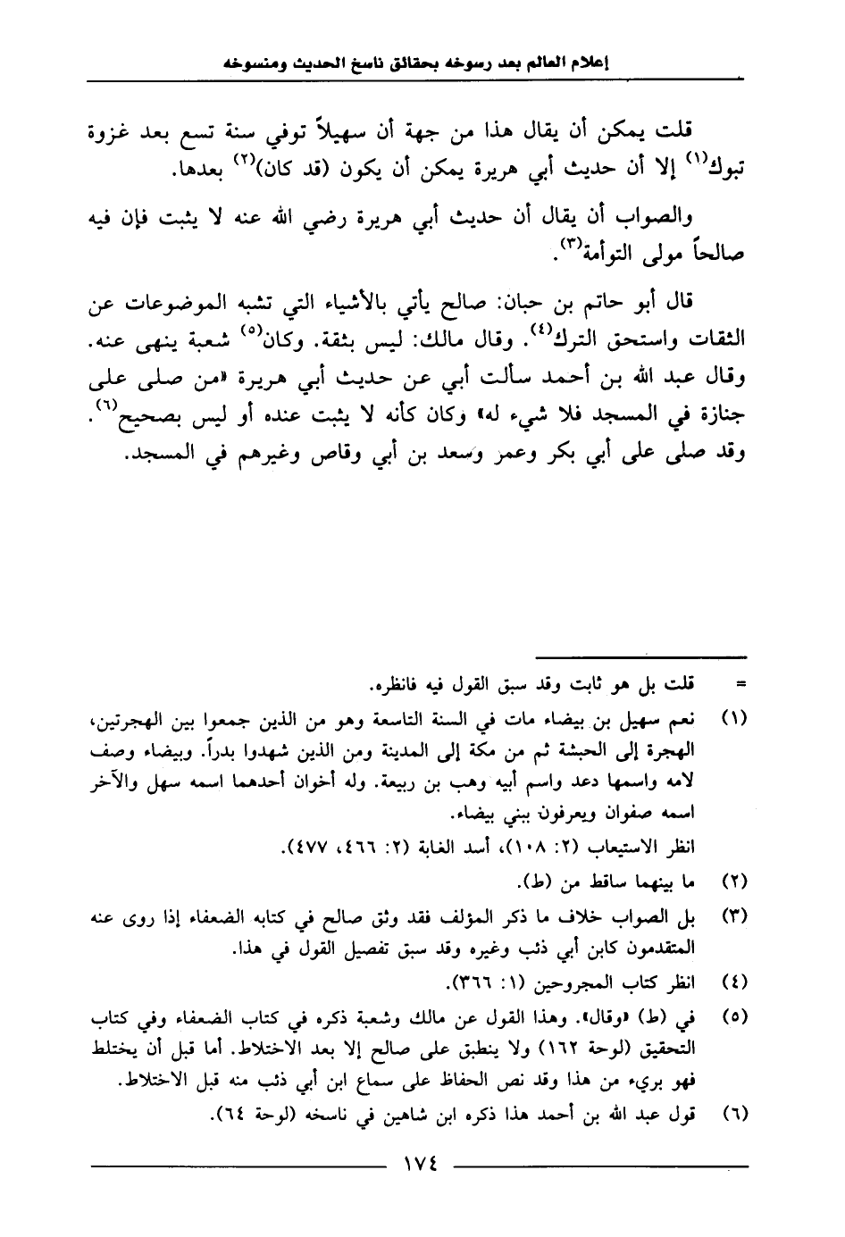 قُلْتُ يُمْكِنُ أَنْ يُقَالَ هَذَا مِنْ جِهَةٍ أَنَّ سُهَيْلًا تُوُفِّيَ سَنَةَ تِسْعٍ بَعْدَ غَزْوَةِ تَبُوكٍ إِلَّا أَنَّ حَدِيثَ أَبِي هُرَيْرَةَ يُمْكِنُ أَنْ يَكُونَ قَدْ كَانَ بَعْدَهَا.