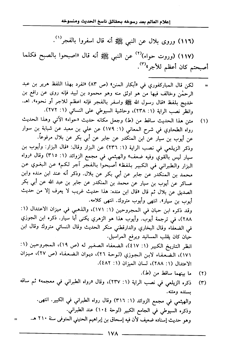 115 116 - وَرَوَى بِلَالٌ، عَنِ النَّبِيِّ صَلَّى اللَّهُ عَلَيْهِ وَسَلَّمَ، أَنَّهُ قَالَ: «أسْفِرُوا بِالْفَجْرِ» 116 117 - وَرَوَتْ حَوَّاءُ، عَنِ النَّبِيِّ صَلَّى اللَّهُ عَلَيْهِ وَسَلَّمَ، أَنَّهُ قَالَ: «أَصْبِحُوا بِالصُّبْحِ، فَكُلَّمَا أَصْبَحْتُمْ كَانَ أَعْظَمَ لِلْأَجْرِ» .
