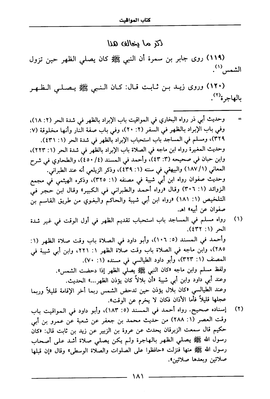 119 - رَوَى جَابِرُ بْنُ سَمُرَةَ، أَنَّ النَّبِيَّ صَلَّى اللَّهُ عَلَيْهِ وَسَلَّمَ: «كَانَ يُصَلِّي الظُّهْرَ حِينَ تَزُولَ الشَّمْسُ» 119 120 - رَوَى زَيْدُ بْنُ ثَابِتٍ، قَالَ: «كَانَ النَّبِيُّ صَلَّى اللَّهُ عَلَيْهِ وَسَلَّمَ يُصَلِّي الظُّهْرَ بِالْهَاجِرَةِ»