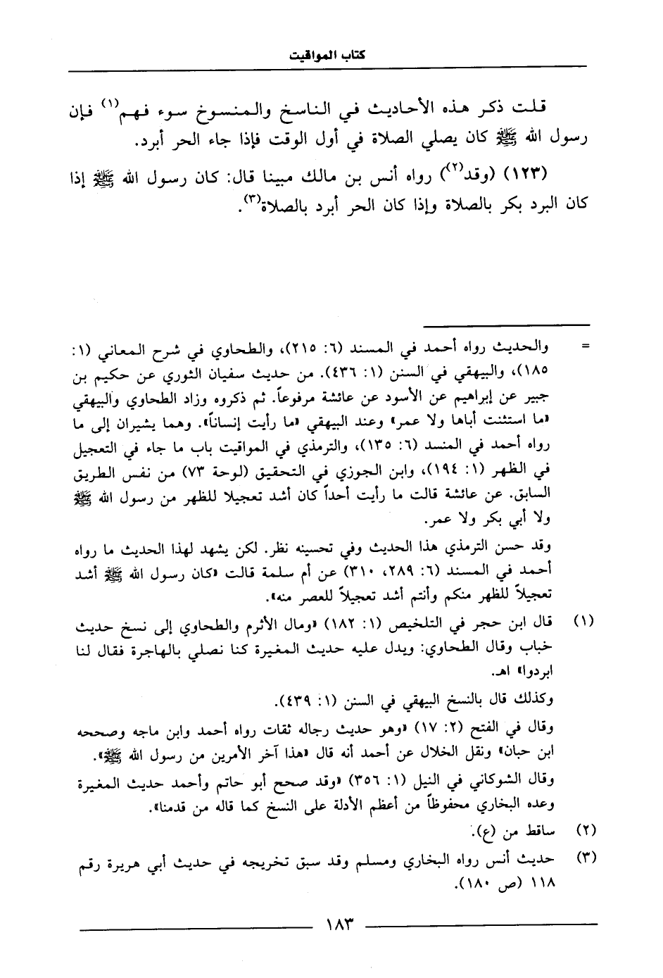قُلْتُ: ذِكْرُ هَذِهِ الْأَحَادِيثِ فِي النَّاسِخِ وَالْمَنْسُوخِ سُوءُ فِهْمٍ، فَإِنَّ رَسُولَ اللَّهِ صَلَّى اللَّهُ عَلَيْهِ وَسَلَّمَ: «كَانَ يُصَلِّي الصَّلَاةَ فِي أَوَّلِ الْوَقْتِ فَإِذَا جَاءَ الْحَرُّ أَبْرَدَ» 122 123 - وَقَدْ رَوَاهُ أَنَسُ بْنُ مَالِكٍ مُبَيِّنًا، قَالَ: كَانَ رَسُولُ اللَّهِ صَلَّى اللَّهُ عَلَيْهِ وَسَلَّمَ: «إِذَا كَانَ الْبَرْدُ بَكَّرَ بِالصَّلَاةِ، وَإِذَا كَانَ الْحَرُّ أَبْرَدَ بِالصَّلَاةِ»