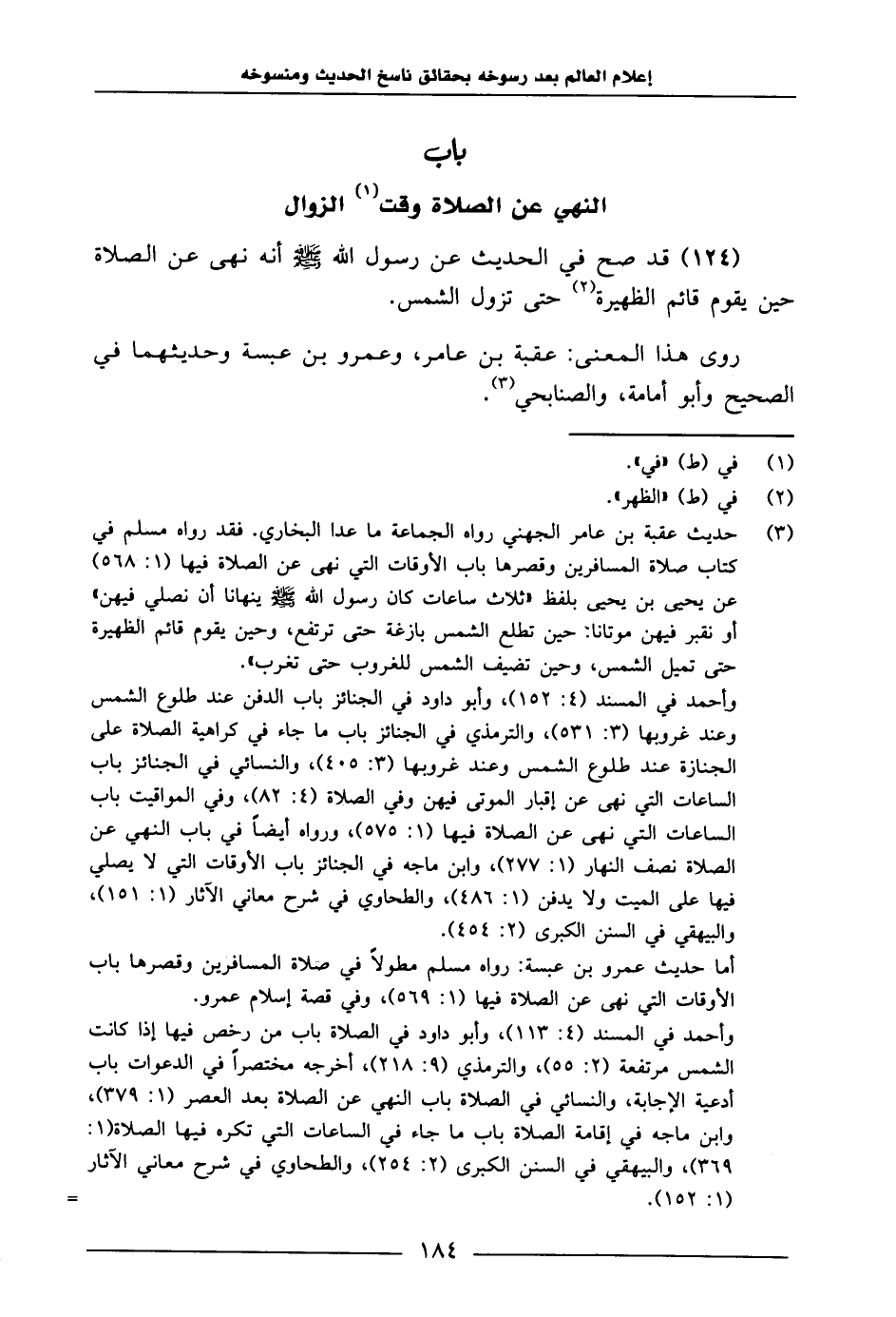 124 - قَدْ صَحَّ فِي الْحَدِيثِ عَنْ رَسُولِ اللَّهِ صَلَّى اللَّهُ عَلَيْهِ وَسَلَّمَ: «أَنَّهُ نَهَى عَنِ الصَّلَاةِ حِينَ يَقُومُ قَائِمُ الظَّهِيرَةِ حَتَّى تَزُولَ الشَّمْسُ» .