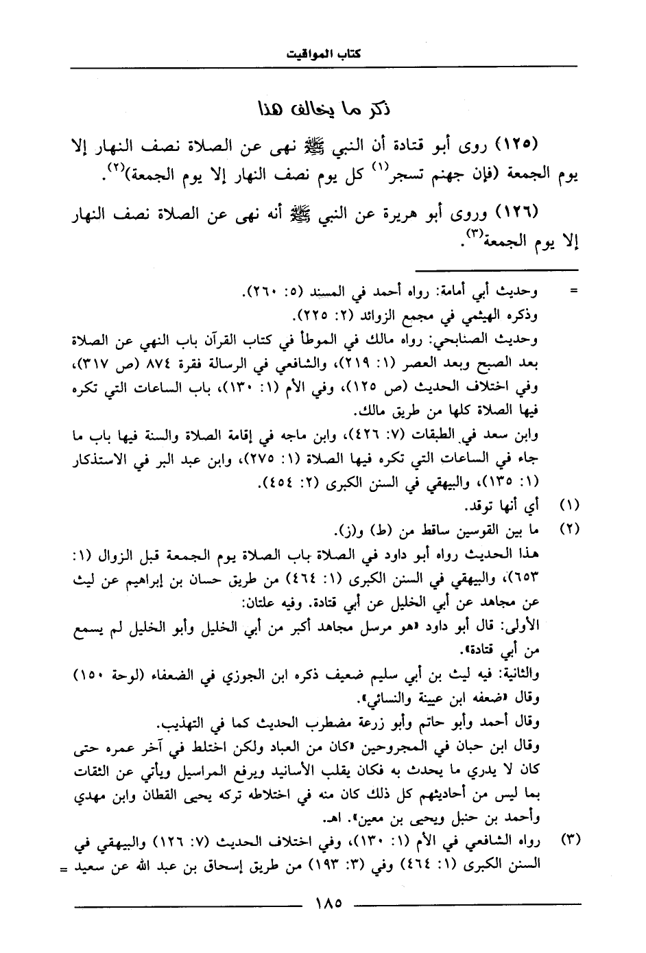 125 - رَوَى أَبُو قَتَادَةَ، أَنَّ النَّبِيَّ صَلَّى اللَّهُ عَلَيْهِ وَسَلَّمَ: «نَهَى عَنِ الصَّلَاةِ نِصْفَ النَّهَارِ إِلَّا يَوْمَ الْجُمُعَةِ، فَإِنَّ جَهَنَّمَ تَسْجُرُ كُلَّ يَوْمٍ نِصْفَ النَّهَارِ إِلَّا يَوْمَ الْجُمُعَةِ» 125126 - وَرَوَى أَبُو هُرَيْرَةَ، عَنِ النَّبِيِّ صَلَّى اللَّهُ عَلَيْهِ وَسَلَّمَ: «أَنَّهُ نَهَى عَنِ الصَّلَاةِ نِصْفَ النَّهَارِ إِلَّا يَوْمَ الْجُمُعَةِ» .