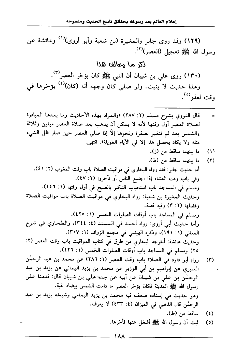130 - رَوَى عَلِيُّ بْنُ شَيْبَانَ: «أَنَّ النَّبِيَّ صَلَّى اللَّهُ عَلَيْهِ وَسَلَّمَ كَانَ يُؤَخِّرُ الْعَصْرَ» .