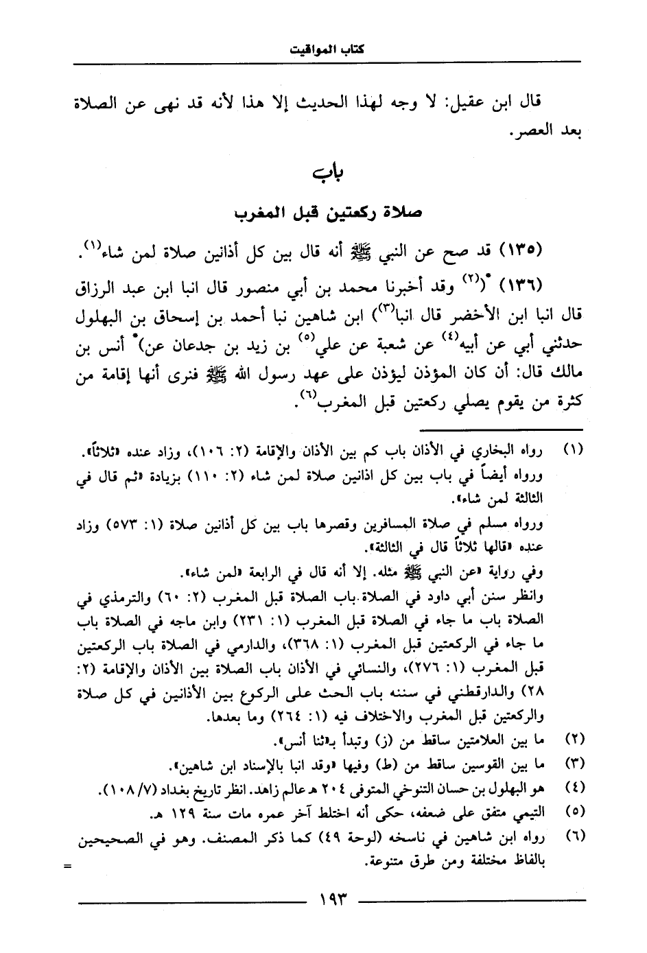 136 - وَقَدْ أَخْبَرَنَا مُحَمَّدُ بْنُ أَبِي مَنْصُورٍ، قَالَ: أَنْبَأَ ابْنُ عَبْدِ الرَّزَّاقِ، قَالَ: أَنْبَأَ ابْنُ الْأَخْضَرِ، قَالَ: أَنْبَأَ ابْنُ شَاهِينَ، نَبَا أَحْمَدُ بْنُ إِسْحَاقَ بْنِ الْبَهْلُولِ، حَدَّثَنِي أَبِي، عَنْ أَبِيهِ، عَنْ شُعْبَةَ، عَنْ عَلِيِّ بْنِ زَيْدٍ بَنِ جُدْعَانٍ، عَنْ أَنَسِ بْنِ مَالِكٍ، قَالَ: «إِنْ كَانَ الْمُؤَذِّنُ لَيُؤَذِّنَ عَلَى عَهْدِ رَسُولِ اللَّهِ صَلَّى اللَّهُ عَلَيْهِ وَسَلَّمَ فَنَرَى أَنَّهَا إِقَامَةٌ مِنْ كَثْرَةِ مَنْ يَقُومُ يُصَلِّي رَكْعَتَيْنِ قَبْلَ الْمَغْرِبِ»