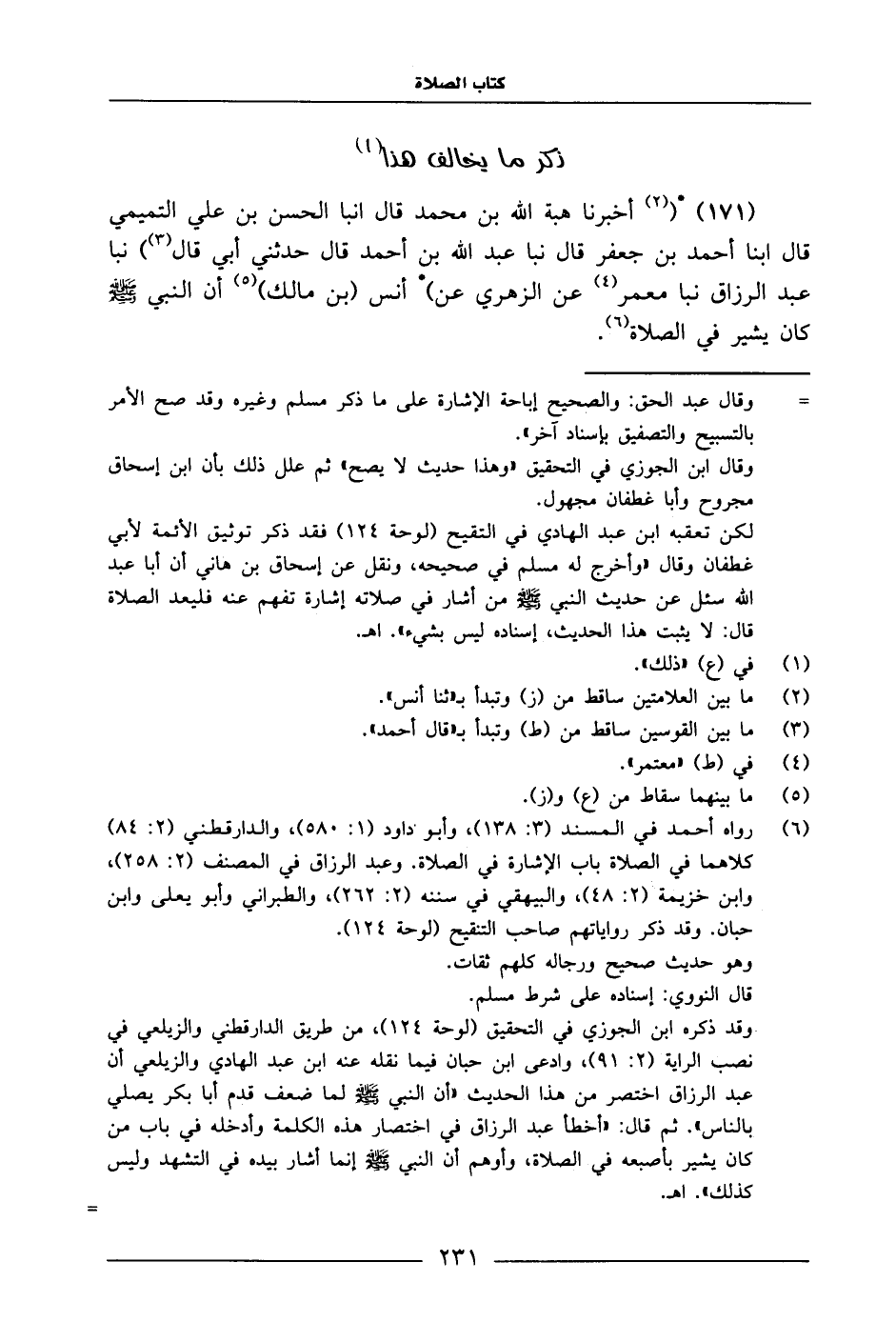 171 - أَخْبَرَنَا هِبَةُ اللَّهِ بْنُ مُحَمَّدٍ، قَالَ: أَنْبَأَ الْحَسَنُ بْنُ عَلِيٍّ قَالَ: أَنْبَأَ أَحْمَدُ بْنُ جَعْفَرٍ، قَالَ: نَبَا عَبْدُ اللَّهِ بْنُ أَحْمَدَ، قَالَ: حَدَّثَنِي أَبِي، قَالَ: نَبَا عَبْدُ الرَّزَّاقِ، نَبَا مَعْمَرٌ، عَنِ الزُّهْرِيِّ، عَنْ أَنَسِ بْنِ مَالِكٍ «أَنَّ النَّبِيَّ صَلَّى اللَّهُ عَلَيْهِ وَسَلَّمَ كَانَ يُشِيرُ فِي الصَّلَاةِ» .
