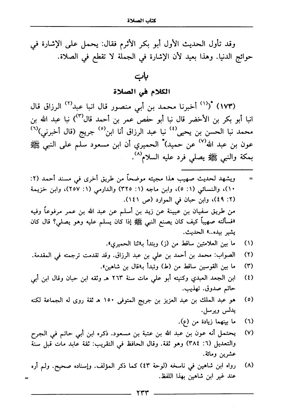 173 - أَخْبَرَنَا مُحَمَّدُ بْنُ أَبِي مَنْصُورٍ، قَالَ: أَنْبَأَ عَبْدُ الرَّزَّاقِ، قَالَ: أَنْبَأَ أَبُو بَكْرِ بْنِ الْأَخْضَرِ، قَالَ: نَبَا أَبُو حَفْصٍ عُمَرُ بْنُ أَحْمَدَ، قَالَ: نَبَا عَبْدُ اللَّهِ بْنُ مُحَمَّدٍ، نَبَا الْحَسَنُ بْنُ يَحْيَى، نَبَا عَبْدُ الرَّزَّاقِ، أَنَا ابْنُ جُرَيْجٍ، قَالَ: أَخْبَرَنِي عَوْنُ بْنُ عَبْدِ اللَّهِ، عَنْ حُمَيْدٍ الْحِمْيَرِيِّ، «أَنَّ ابْنَ مَسْعُودٍ سَلَّمَ عَلَى النَّبِيِّ صَلَّى اللَّهُ عَلَيْهِ وَسَلَّمَ بِمَكَّةَ، وَالنَّبِيُّ صَلَّى اللَّهُ عَلَيْهِ وَسَلَّمَ يُصَلِّي، فَرَدَّ عَلَيْهِ السَّلَامَ»