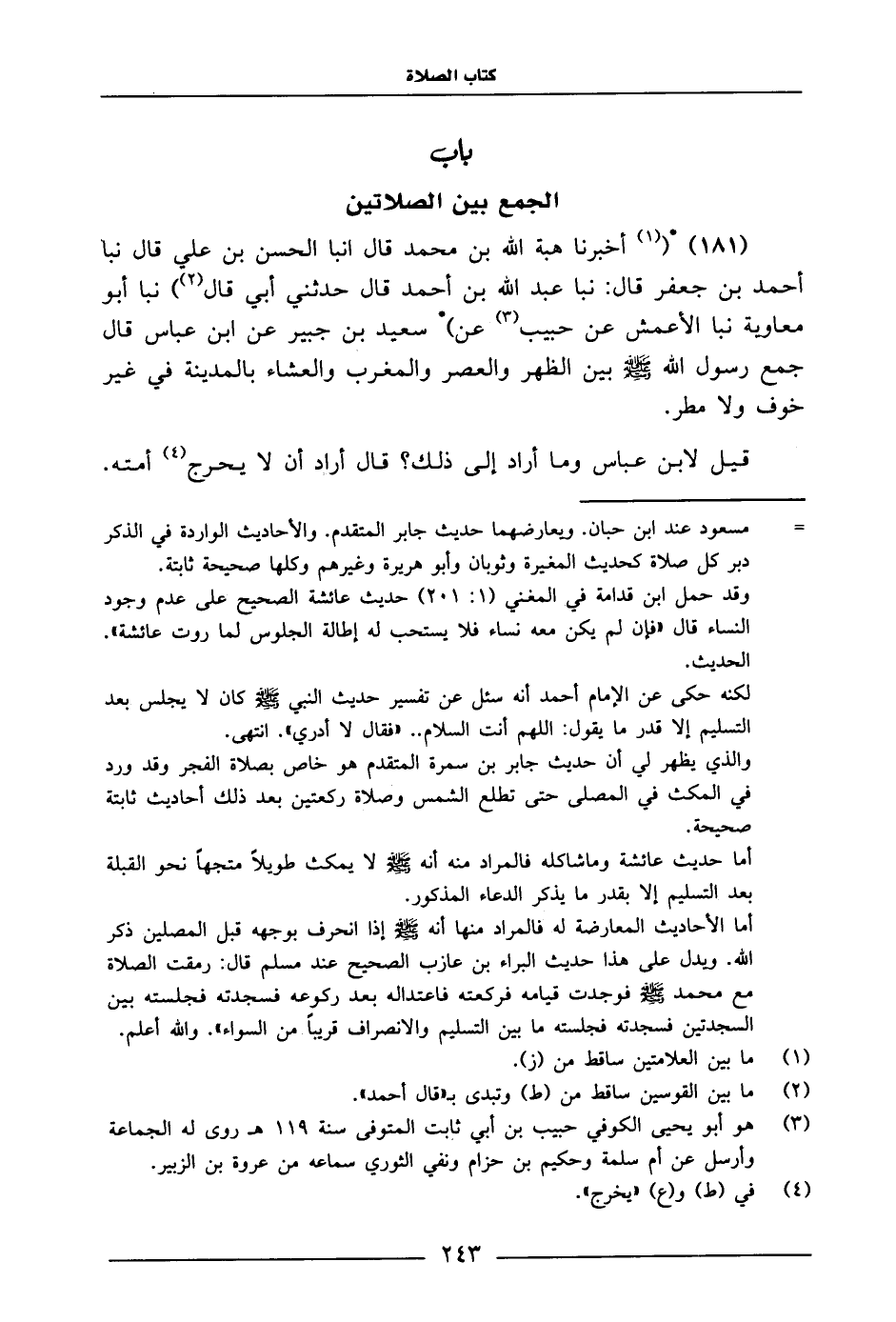 181 - أَخْبَرَنَا هِبَةُ اللَّهِ بْنُ مُحَمَّدٍ، قَالَ: أَنْبَأَ الْحَسَنُ بْنُ عَلِيٍّ، قَالَ: نَبَا أَحْمَدُ بْنُ جَعْفَرٍ، قَالَ: نَبَا عَبْدُ اللَّهِ بْنُ أَحْمَدَ، قَالَ: حَدَّثَنِي أَبِي، قَالَ: نَبَا أَبُو مُعَاوِيَةَ، نَبَا الْأَعْمَشُ، عَنْ حَبِيبٍ، عَنْ سَعِيدِ بْنِ جُبَيْرٍ، عَنِ ابْنِ عَبَّاسٍ، قَالَ: " جَمَعَ رَسُولُ اللَّهِ صَلَّى اللَّهُ عَلَيْهِ وَسَلَّمَ بَيْنَ الظُّهْرِ، وَالْعَصْرِ، وَالْمَغْرِبِ، وَالْعِشَاءِ، بِالْمَدِينَةِ فِي غَيْرِ خَوْفٍ، وَلَا مَطَرٍ.