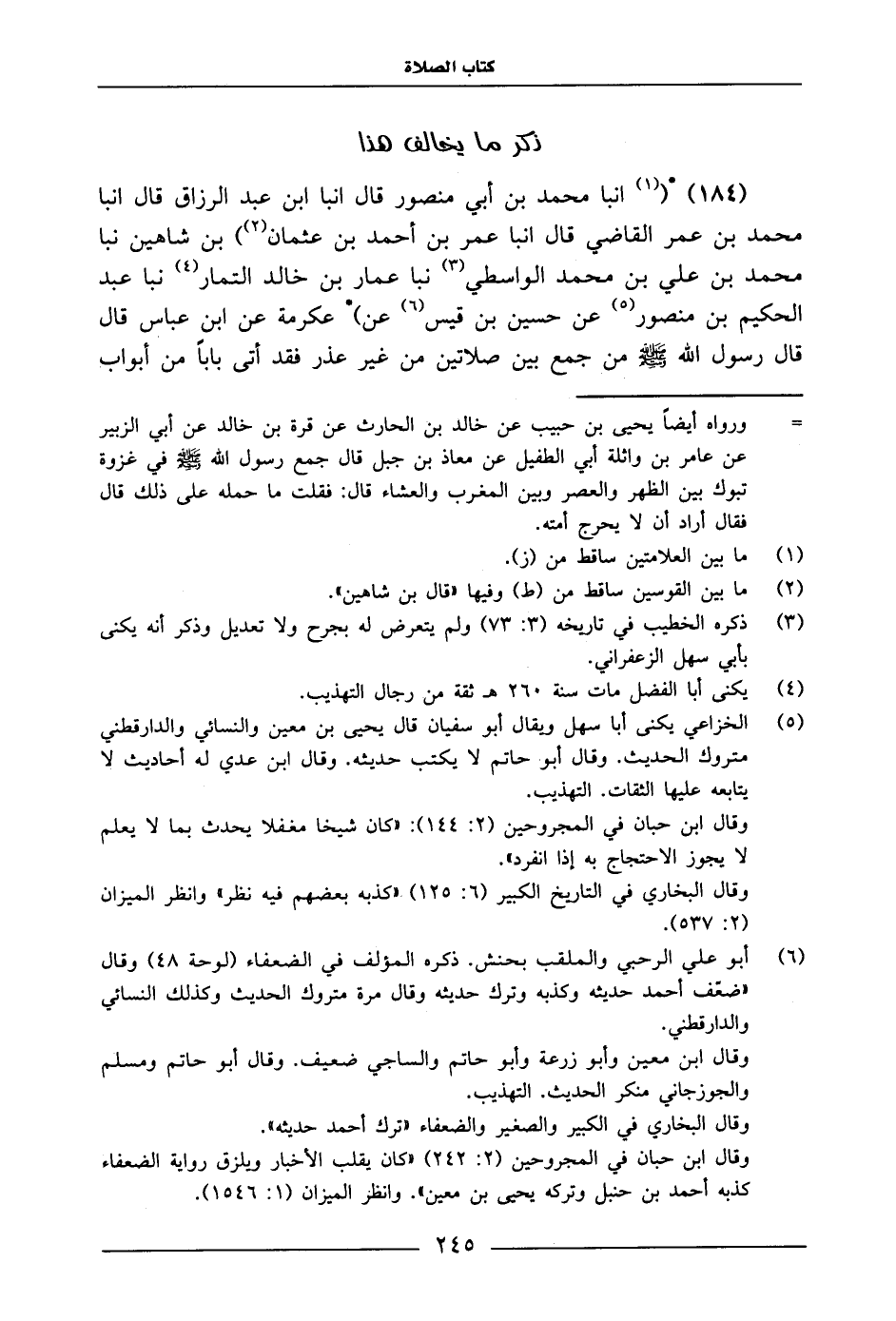 184 - أَنْبَأَ مُحَمَّدُ بْنُ أَبِي مَنْصُورٍ، قَالَ: أَنْبَأَ ابْنُ عَبْدِ الرَّزَّاقِ، قَالَ: أَنْبَأَ مُحَمَّدُ بْنُ عُمَرَ، قَالَ: أَنْبَأَ عُمَرُ بْنُ أَحْمَدَ، نَبَا مُحَمَّدُ بْنُ عَلِيِّ بْنِ مُحَمَّدٍ الْوَاسِطِيُّ، نَبَا عَمَّارُ بْنُ خَالِدٍ التَّمَّارُ، نَبَا عَبْدُ الْحَكِيمِ بْنُ مَنْصُورٍ، عَنْ حُسَيْنِ بْنِ قَيْسٍ، عَنْ عِكْرِمَةَ، عَنِ ابْنِ عَبَّاسٍ، قَالَ: قَالَ رَسُولُ اللَّهِ صَلَّى اللَّهُ عَلَيْهِ وَسَلَّمَ: «مَنْ جَمَعَ صَلَاتَيْنِ مِنْ غَيْرِ عُذْرٍ، فَقَدْ أَتَى بَابًا مِنْ أَبْوَابِ