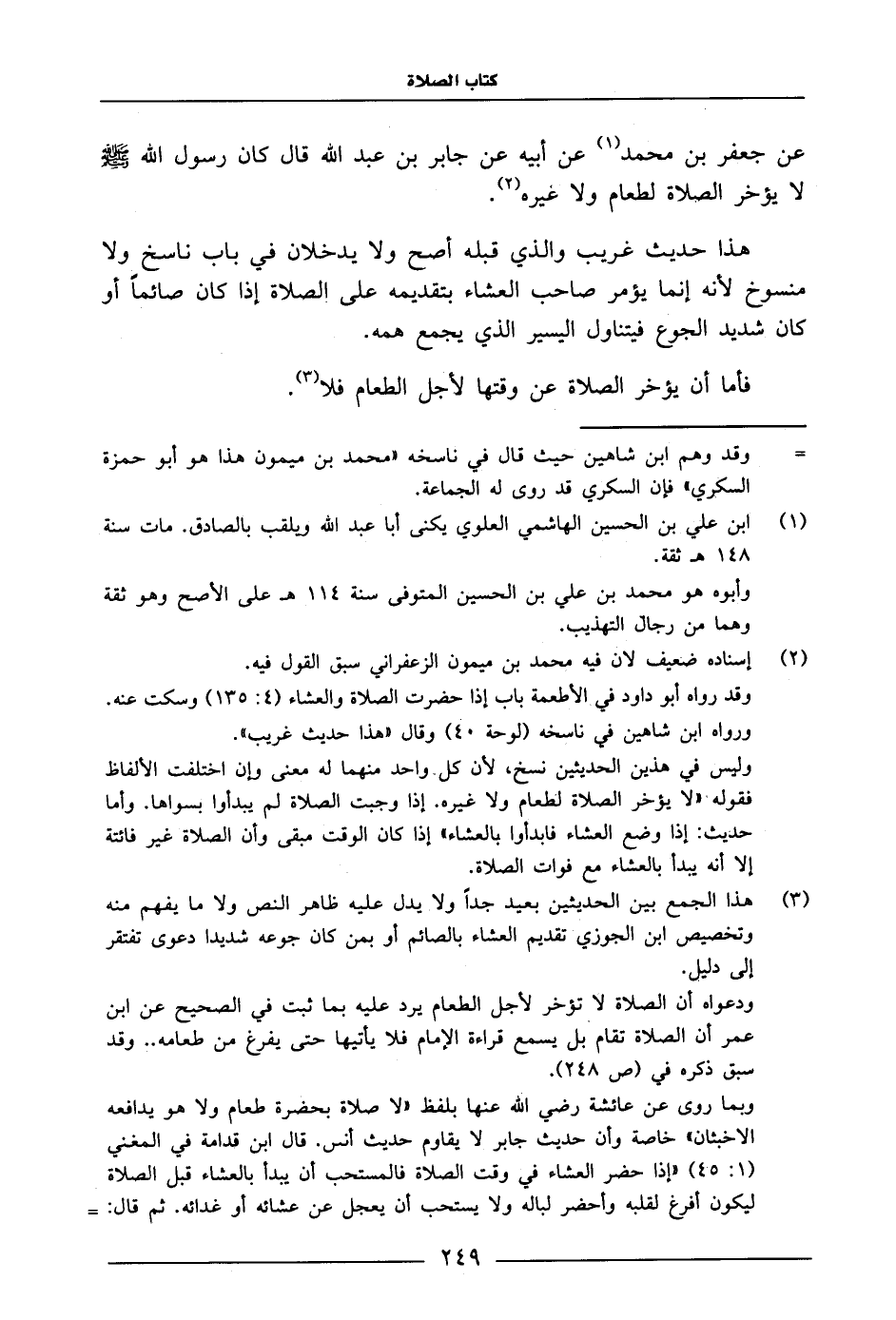 عَنْ جَعْفَرِ بْنِ مُحَمَّدٍ، عَنْ أَبِيهِ، عَنْ جَابِرِ بْنِ عَبْدِ اللَّهِ، قَالَ: كَانَ رَسُولُ اللَّهِ صَلَّى اللَّهُ عَلَيْهِ وَسَلَّمَ «لَا يُؤَخِّرُ الصَّلَاةَ لِطَعَامٍ، وَلَا غَيْرِهِ» .