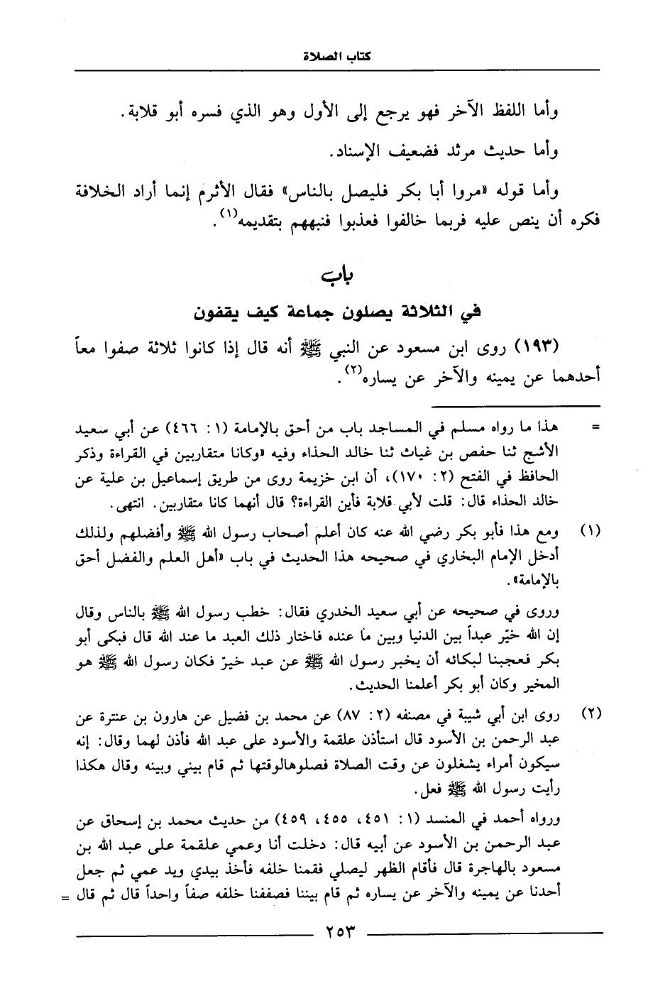 193 - رَوَى ابْنُ مَسْعُودٍ، عَنِ النَّبِيِّ صَلَّى اللَّهُ عَلَيْهِ وَسَلَّمَ، أَنَّهُ قَالَ: «إِذَا كَانُوا ثَلَاثَةً صُفُّوا مَعًا، أَحَدُهُمَا عَنْ يَمِينِهِ، وَالْآخَرُ عَنْ يَسَارِهِ»