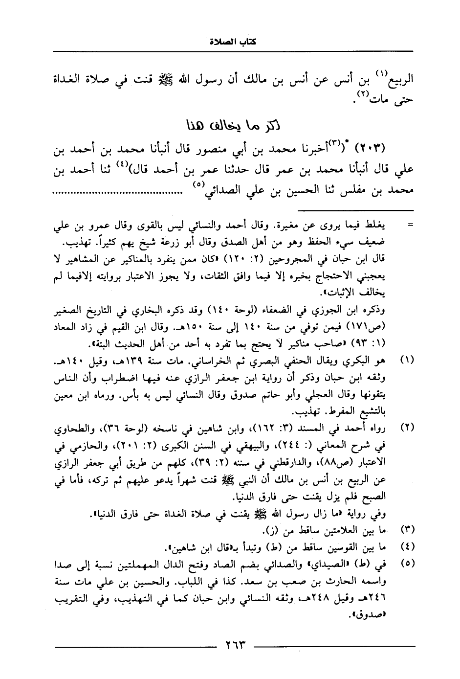 الرَّبِيعِ بْنِ أَنَسٍ، عَنْ أَنَسِ بْنِ مَالِكٍ: «أَنَّ رَسُولَ اللَّهِ صَلَّى اللَّهُ عَلَيْهِ وَسَلَّمَ قَنَتَ فِي صَلَاةِ الْغَدَاةِ حَتَّى مَاتَ»