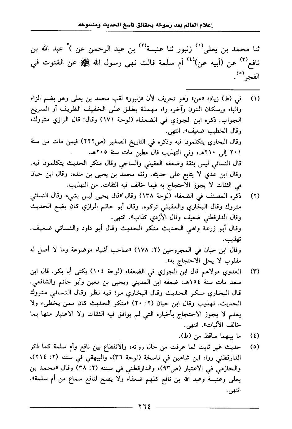 ثنا مُحَمَّدُ بْنُ يَعْلَى زُنُبْورُ، ثنا عَنْبَسَةُ بْنُ عَبْدِ الرَّحْمَنِ، عَنْ عَبْدِ اللَّهِ بْنِ نَافِعٍ، عَنْ أَبِيهِ، عَنْ أُمِّ سَلَمَةَ، قَالَتْ: نَهَى رَسُولُ اللَّهِ صَلَّى اللَّهُ عَلَيْهِ وَسَلَّمَ " عَنِ الْقُنُوتِ فِي الْفَجْرِ.