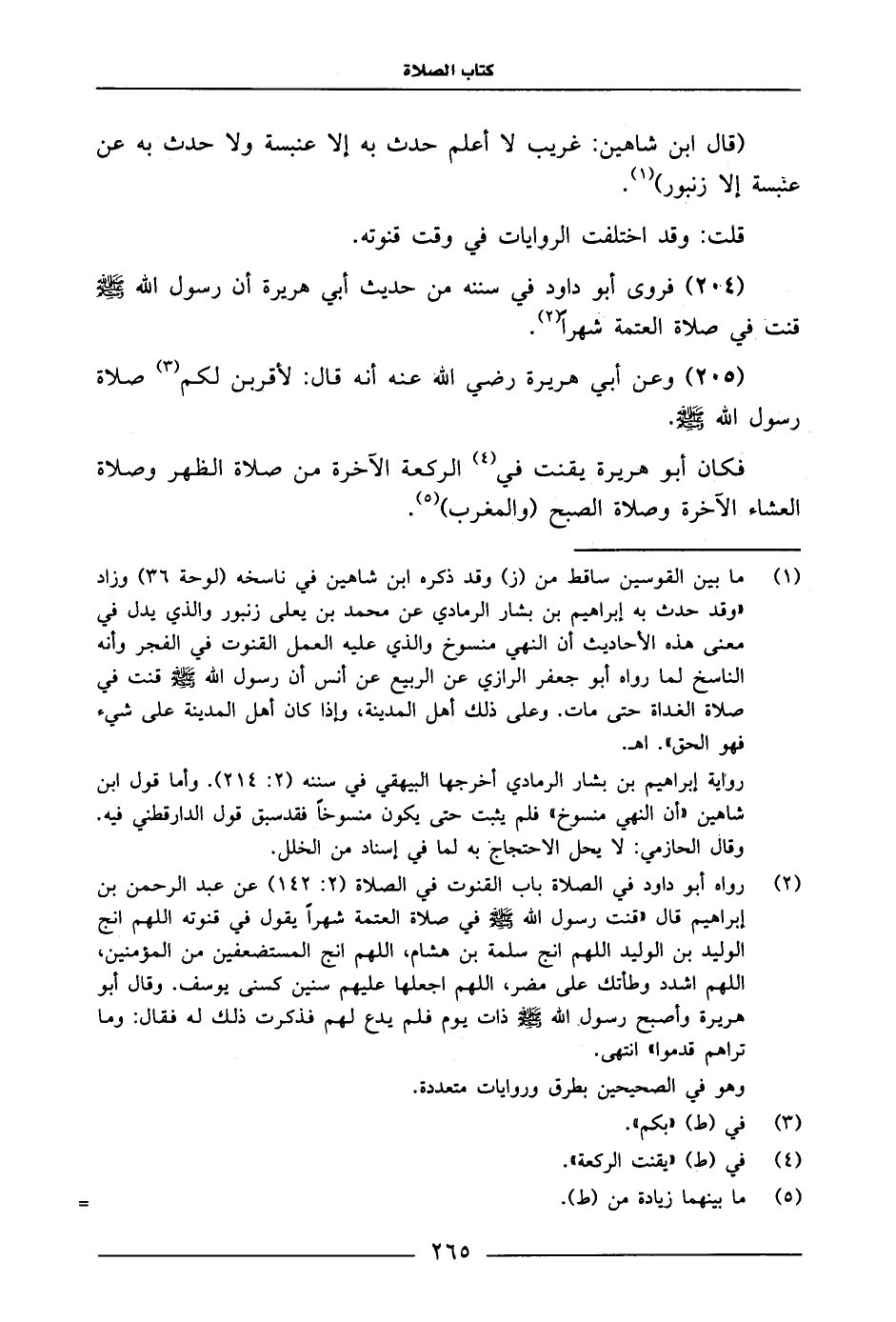 204 - فَرَوَى أَبُو دَاوُدَ فِي سُنَنُهُ مِنْ حَدِيثِ أَبِي هُرَيْرَةَ: «أَنَّ رَسُولَ اللَّهِ صَلَّى اللَّهُ عَلَيْهِ وَسَلَّمَ قَنَتَ فِي صَلَاةِ الْعَتَّمَةِ شَهْرًا»