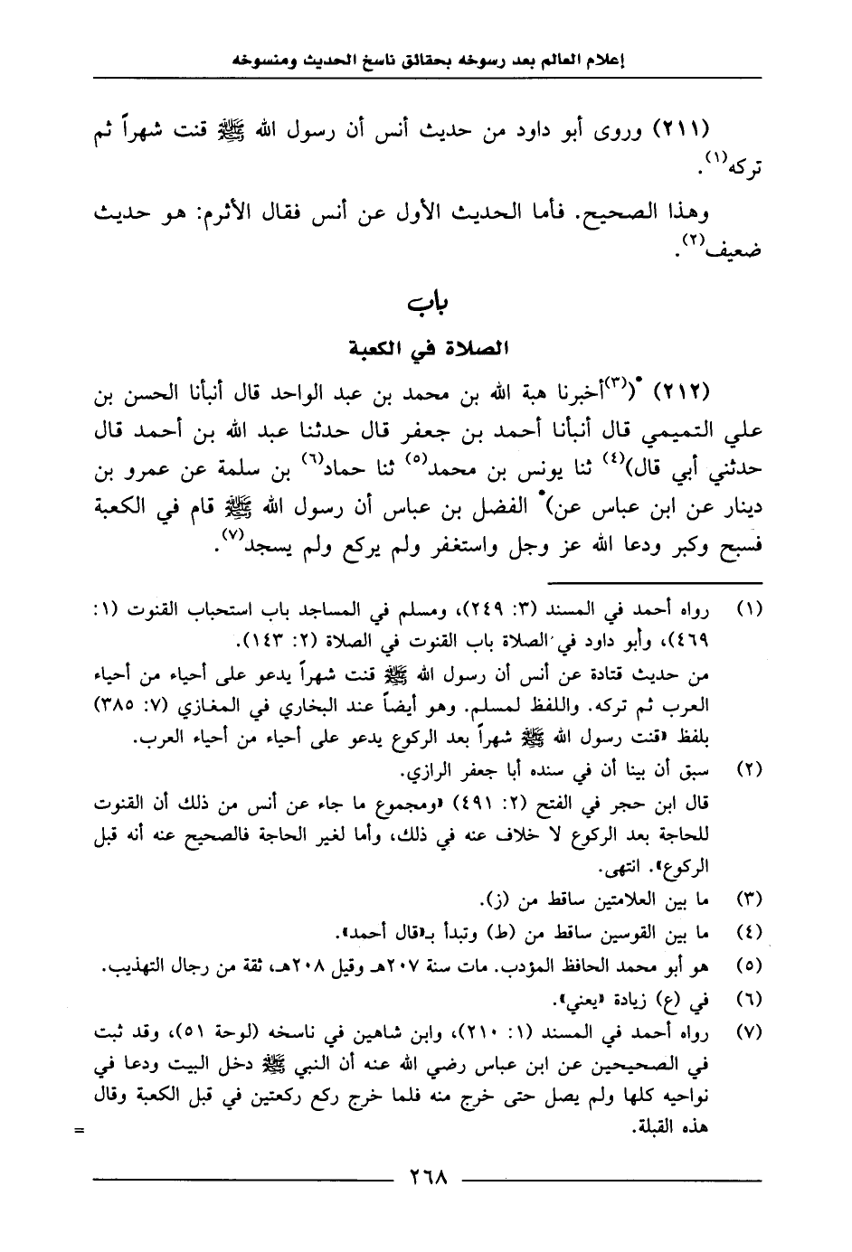 212 - أَخْبَرَنَا هِبَةُ اللَّهِ بْنُ مُحَمَّدِ بْنِ عَبْدِ الْوَاحِدِ، قَالَ: أَنْبَأَنَا الْحَسَنُ عَلِيٍّ التَّمِيمِيُّ، قَالَ: أنبأنَا أَحْمَدُ بْنُ جَعْفَرٍ، قَالَ: حَدَّثَنَا عَبْدُ اللَّهِ بْنُ أَحْمَدَ، قَالَ حَدَّثَنِي أَبِي، قَالَ: ثنا يُونُسُ بْنُ مُحَمَّدٍ، ثنا حَمَّادُ بْنُ سَلَمَةَ، عَنْ عَمْرِو بْنِ دِينَارٍ، عَنِ ابْنِ عَبَّاسٍ، عَنِ الْفَضْلِ بْنِ عَبَّاسٍ «أَنَّ رَسُولَ اللَّهِ صَلَّى اللَّهُ عَلَيْهِ وَسَلَّمَ قَامَ فِي الْكَعْبَةِ، فَسَبَّحَ وَكَبَّرَ، وَدَعَا اللَّهُ عَزَّ وَجَلَّ، وَاسْتَغْفَرَ، وَلَمْ يَرْكَعْ، وَلَمْ يَسْجُدْ»