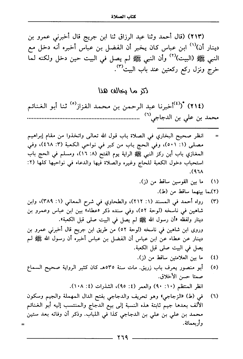 213 - قَالَ أَحْمَدُ: وَثَنَا عَبْدُ الرَّزَّاقِ، ثنا ابْنُ جُرَيْجٍ، قَالَ: أَخْبَرَنِي عَمْرُو بْنُ دِينَارٍ، أَنَّ ابْنَ عَبَّاسٍ كَانَ يُخْبُرُ أَنَّ الْفَضْلَ بْنَ عَبَّاسٍ أَخْبَرَهُ «أَنَّهُ دَخَلَ مَعَ النَّبِيِّ صَلَّى اللَّهُ عَلَيْهِ وَسَلَّمَ الْبَيْتَ، وَأَنَّ النَّبِيَّ صَلَّى اللَّهُ عَلَيْهِ وَسَلَّمَ لَمْ يُصَلِّ فِي الْبَيْتِ حِينَ دَخَلَ وَلَكِنَّهُ لَمَّا خَرَجَ وَنَزَلَ رَكَعَ رَكْعَتَيْنِ عِنْدَ بَابِ الْبَيْتِ»