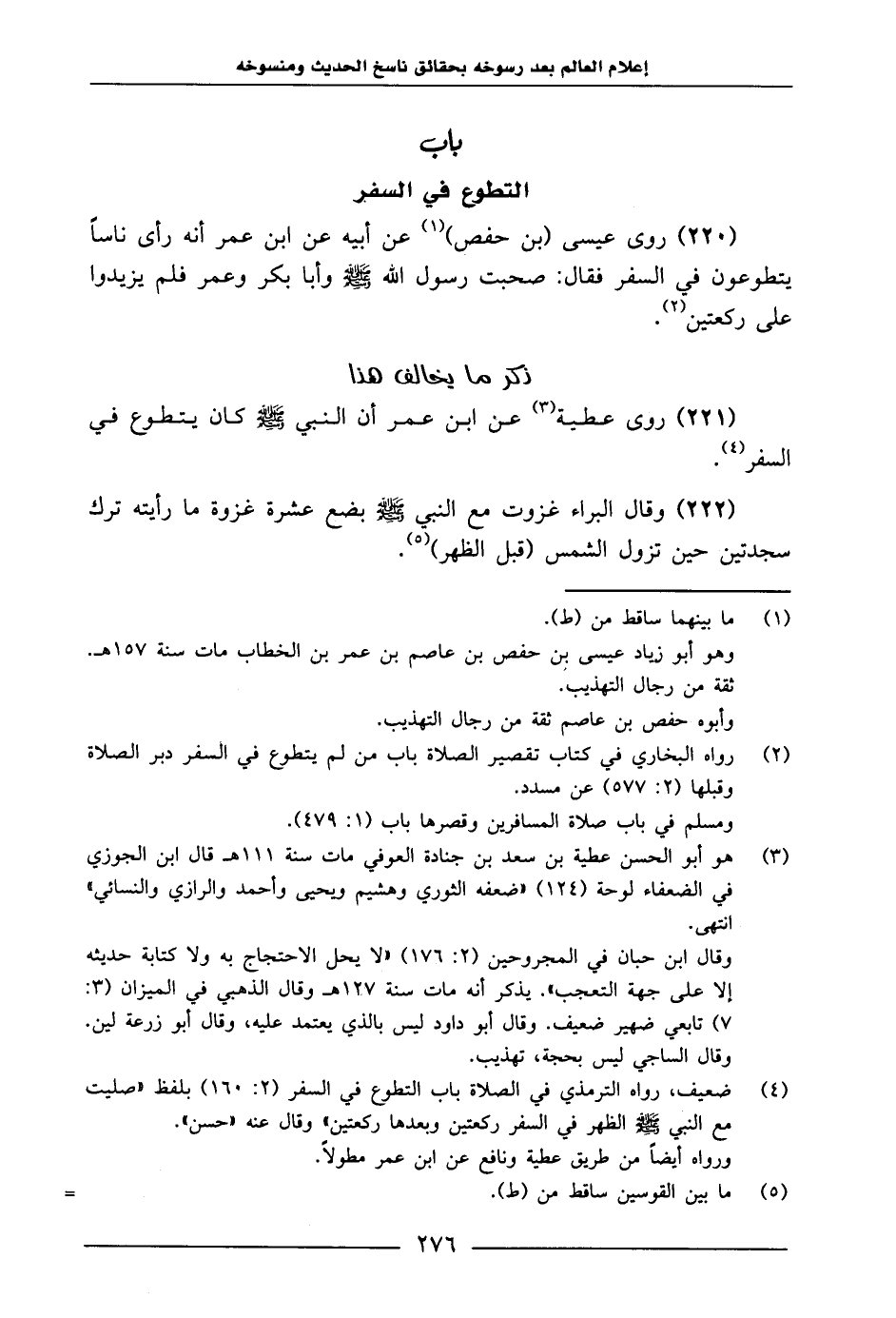 221 - رَوَى عَطِيَّةُ، عَنِ ابْنِ عُمَرَ «أَنَّ النَّبِيَّ صَلَّى اللَّهُ عَلَيْهِ وَسَلَّمَ كَانَ يَتَطَوَّعُ فِي السَّفَرِ» 215 222 - وَقَالَ الْبَرَاءُ: «غَزَوْتُ مَعَ النَّبِيِّ صَلَّى اللَّهُ عَلَيْهِ وَسَلَّمَ بِضْعَ عَشْرَةَ غَزْوَةً مَا رَأَيْتُهُ تَرَكَ سَجْدَتَيْنِ حِينَ تَزُولُ الشَّمْسُ قَبْلَ الظُّهْرِ»