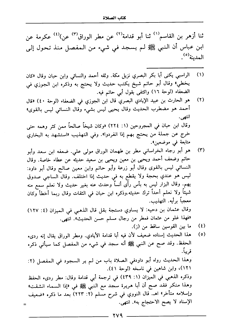ثنا أَزْهَرُ بْنُ الْقَاسِمِ، ثنا أَبُو قُدَامَةَ، عَنْ مَطَرٍ الْوَرَّاقِ، عَنْ عِكْرِمَةَ، عَنِ ابْنِ عَبَّاسٍ «أَنَّ النَّبِيَّ صَلَّى اللَّهُ عَلَيْهِ وَسَلَّمَ لَمْ يَسْجُدْ فِي شَيْءٍ مِنِ الْمُفَصَّلِ مُنْذُ تَحَوَّلَ إِلَى الْمَدِينَةِ» .