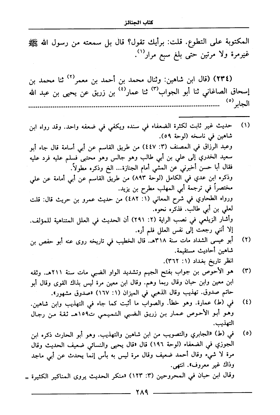 234 - قَالَ ابْنُ شَاهِينَ: وَثَنَا مُحَمَّدُ بْنُ أَحْمَدَ بْنِ مَعْمَرٍ، ثنا مُحَمَّدُ بْنُ إِسْحَاقَ الصَّاغَانِيُّ، ثنا أَبُو الْجَوَابِ، ثنا عَمَّارُ بْنُ زُرَيْقٍ، عَنْ يَحْيَى بْنِ عَبْدِ اللَّهِ الْجَابِرِ،