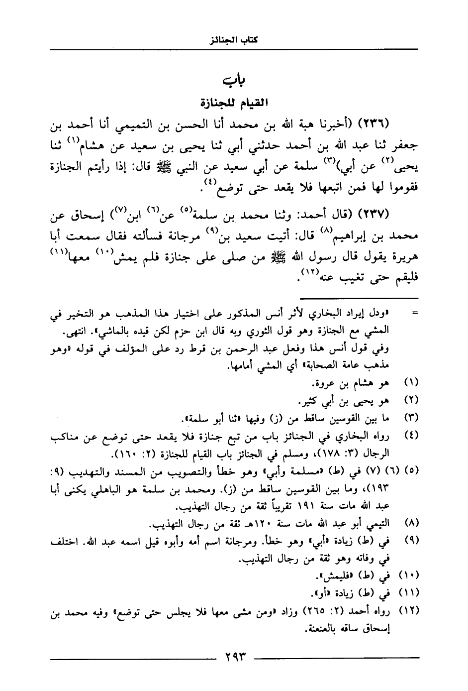 236 - أَخْبَرَنَا هِبَةُ اللَّهِ بْنُ مُحَمَّدٍ، أَنَا الْحَسَنُ بْنُ التَّمِيمِيُّ، أَنَا أَحْمَدُ بْنُ جَعْفَرٍ، ثنا عَبْدُ اللَّهِ بْنُ أَحْمَدَ حَدَّثَنِي أَبِي، ثنا يَحْيَى بْنُ سَعِيدٍ، عَنْ هِشَامٍ، ثنا يَحْيَى، عَنْ أَبِي سَلَمَةَ، عَنْ أَبِي سَعِيدٍ، عَنِ النَّبِيِّ صَلَّى اللَّهُ عَلَيْهِ وَسَلَّمَ، قَالَ: «إِذَا رَأَيْتُمِ الْجِنَازَةَ، فَقُومُوا لَهَا فَمَنِ اتَّبَعَهَا، فَلَا يَقْعُدُ حَتَّى تُوضَعَ»