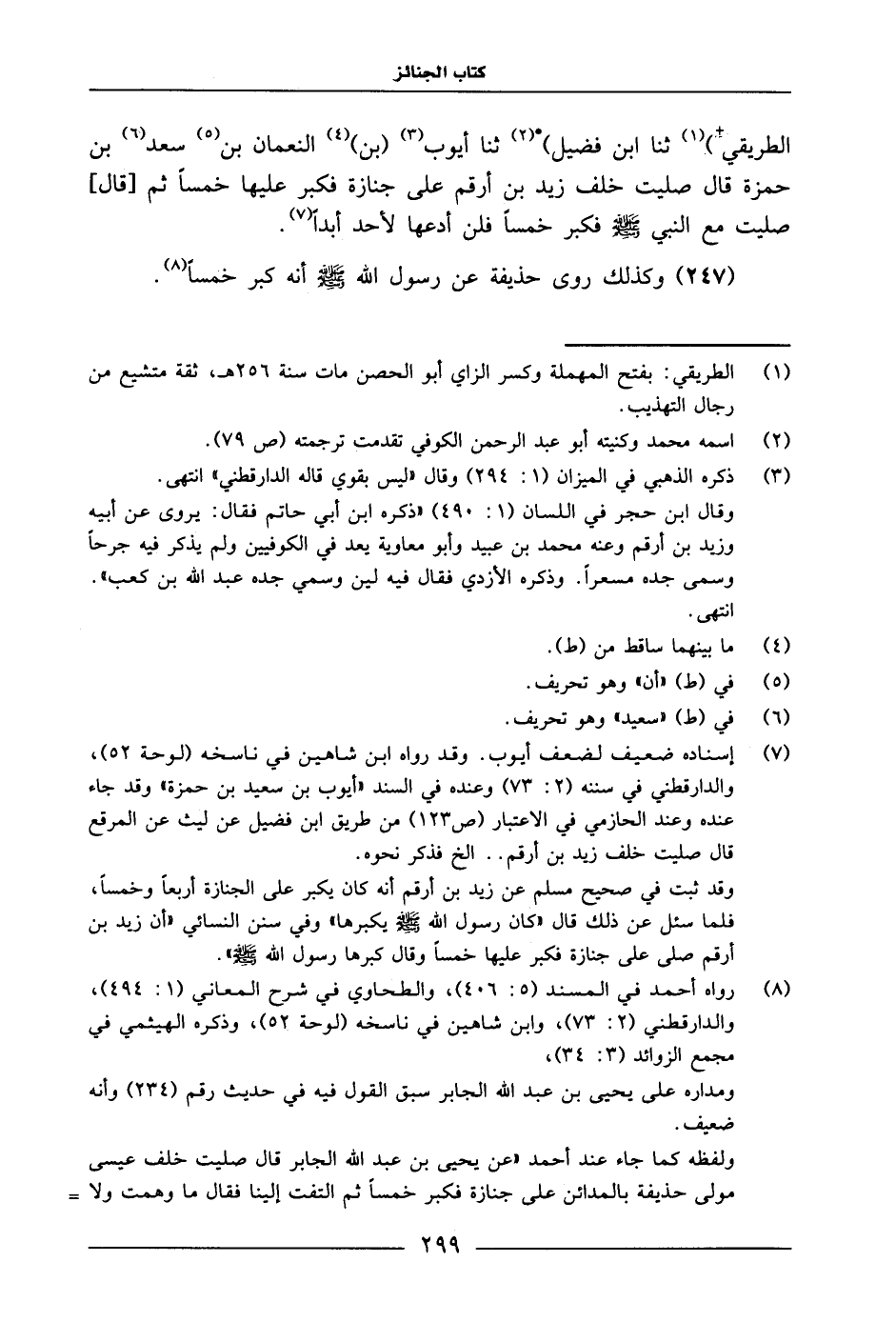 الطَّرِيقِيُّ، ثنا ابْنُ فُضَيْلٍ، ثنا أَيُّوبُ بْنُ النُّعْمَانِ بْنِ سَعْدِ بْنِ حَمْزَةَ، قَالَ: صَلَّيْتُ خَلْفَ زَيْدِ بْنِ أَرْقَمٍ عَلَى جِنَازَةٍ، فَكَبَّرَ عَلَيْهَا خَمْسًا، ثُمَّ قَالَ: «صَلَّيْتُ مَعَ النَّبِيِّ فَكَبَّرَ خَمْسًا» .