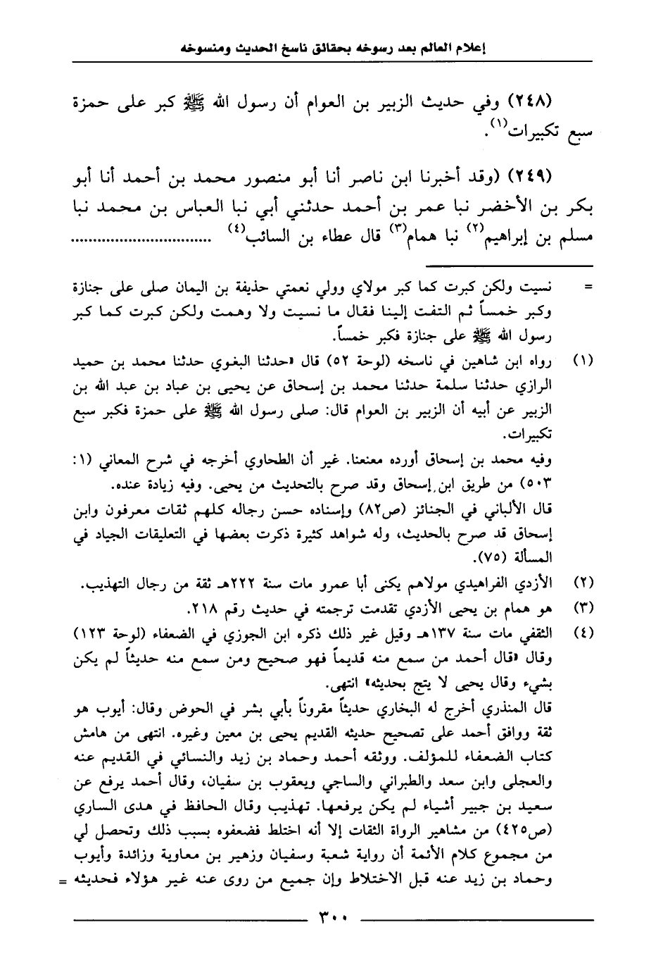 248 - وَفِي حَدِيثِ الزُّبَيْرِ بْنِ الْعَوَّامِ: «أَنَّ رَسُولَ اللَّهِ صَلَّى اللَّهُ عَلَيْهِ وَسَلَّمَ كَبَّرَ عَلَى حَمْزَةَ سَبْعَ تَكْبِيرَاتٍ»