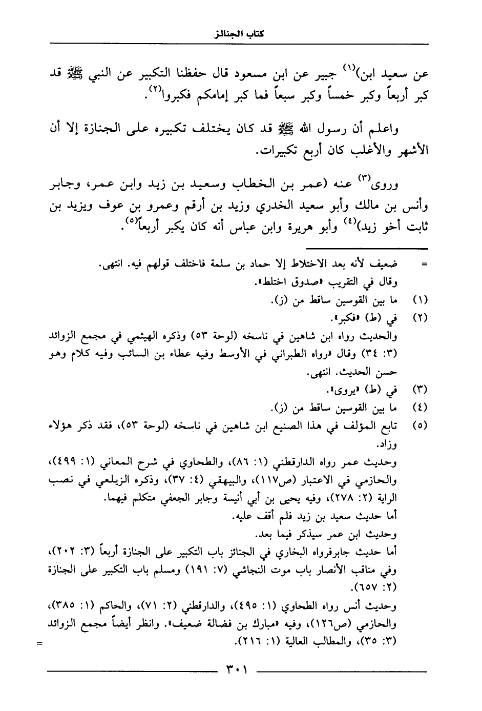 عَنْ سَعِيدِ بْنِ جُبَيْرٍ، عَنِ ابْنِ مَسْعُودٍ، قَالَ: حَفِظْنَا التَّكْبِيرَ، عَنِ النَّبِيِّ صَلَّى اللَّهُ عَلَيْهِ وَسَلَّمَ: «قَدْ كَبَّرَ أَرْبَعًا، وَكَبَّرَ خَمْسًا، وَكَبَّرَ سَبْعًا، فَمَا كَبَّرَ إِمَامُكُمْ، فَكَبِّرُوا، وَاعْلَمْ أَنَّ رَسُولَ اللَّهِ صَلَّى اللَّهُ عَلَيْهِ وَسَلَّمَ قَدْ كَانَ يَخْتَلِفُ تَكْبِيرَهُ عَلَى الْجِنَازَةِ إِلَّا أَنَّ الْأَشْهَرَ، وَالْأَغْلَبَ كَانَ أَرْبَعَ تَكْبِيرَاتٍ» .