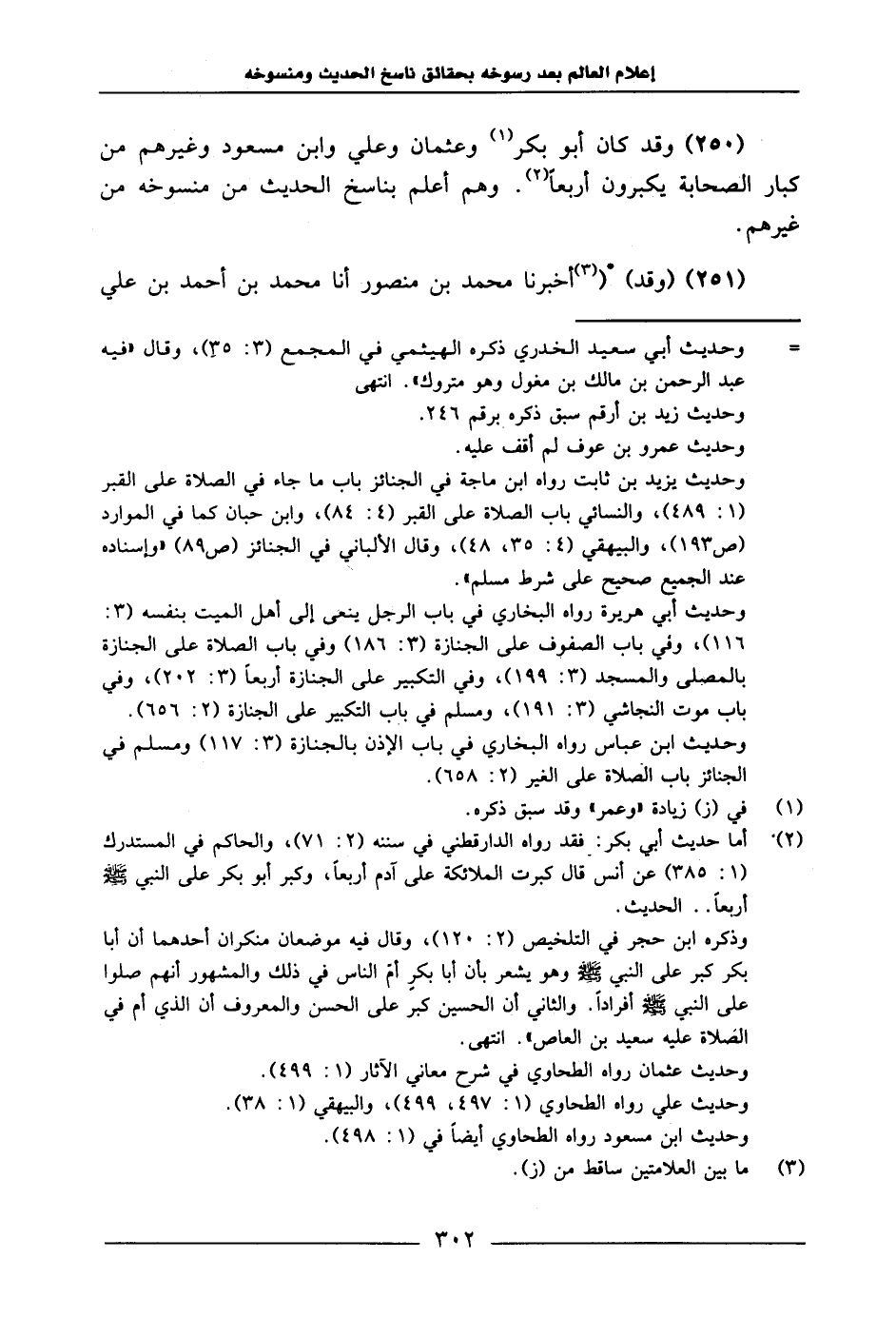 250- وَقَدْ كَانَ أَبُو بَكْرٍ، وَعُثْمَانُ، وَعَلِيٌّ، وَابْنُ مَسْعُودٍ، وَغَيْرُهُمْ مِنْ كِبَارِ الصَّحَابَةِ، يُكُبِّرُونَ أَرْبَعًا.