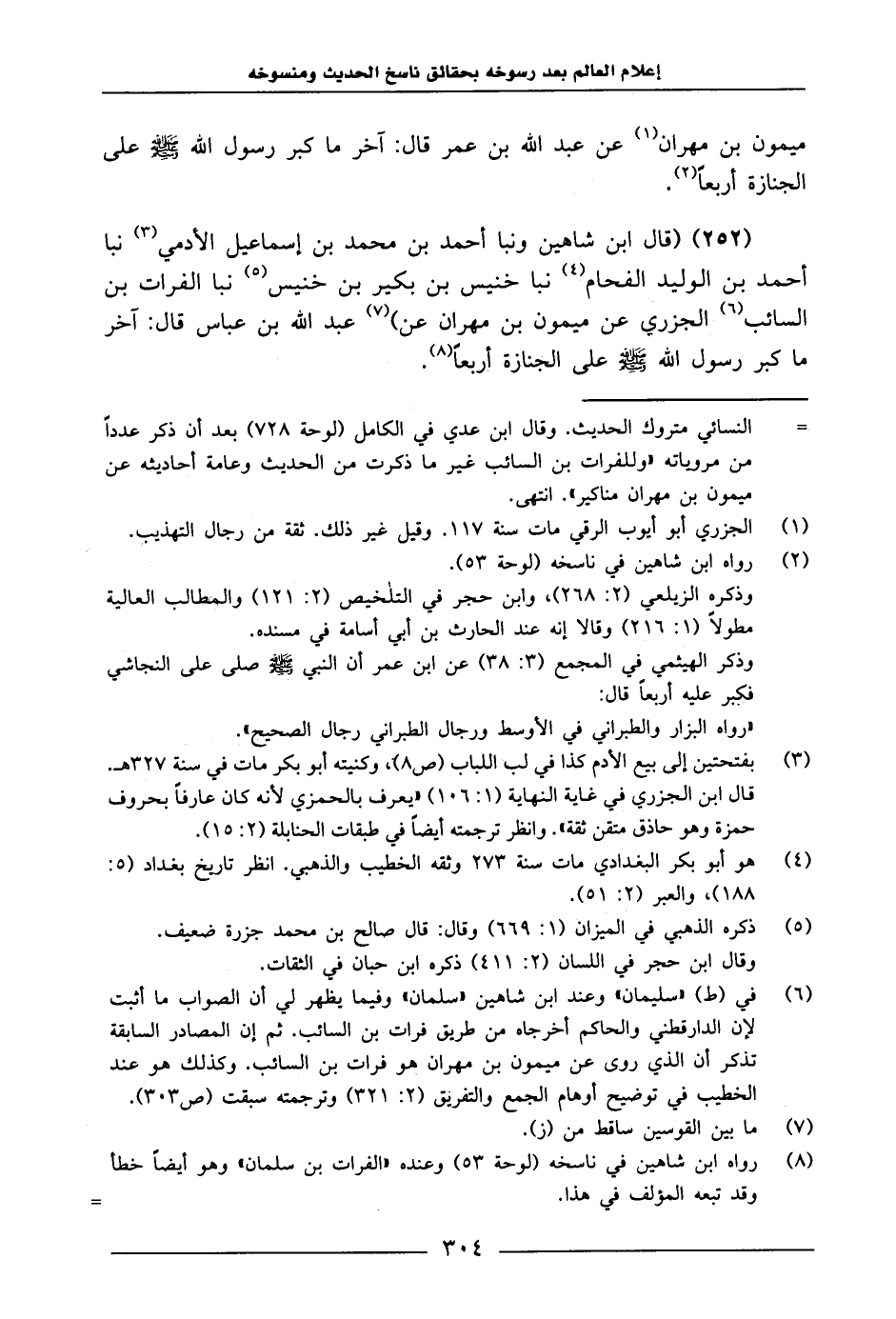 مَيْمُونَ بْنِ مِهْرَانَ، عَنْ عَبْدِ اللَّهِ بْنِ عُمَرَ، قَالَ: «آخِرُ مَا كَبَّرَ رَسُولُ اللَّهِ صَلَّى اللَّهُ عَلَيْهِ وَسَلَّمَ عَلَى الْجِنَازَةِ أَرْبَعًا» .