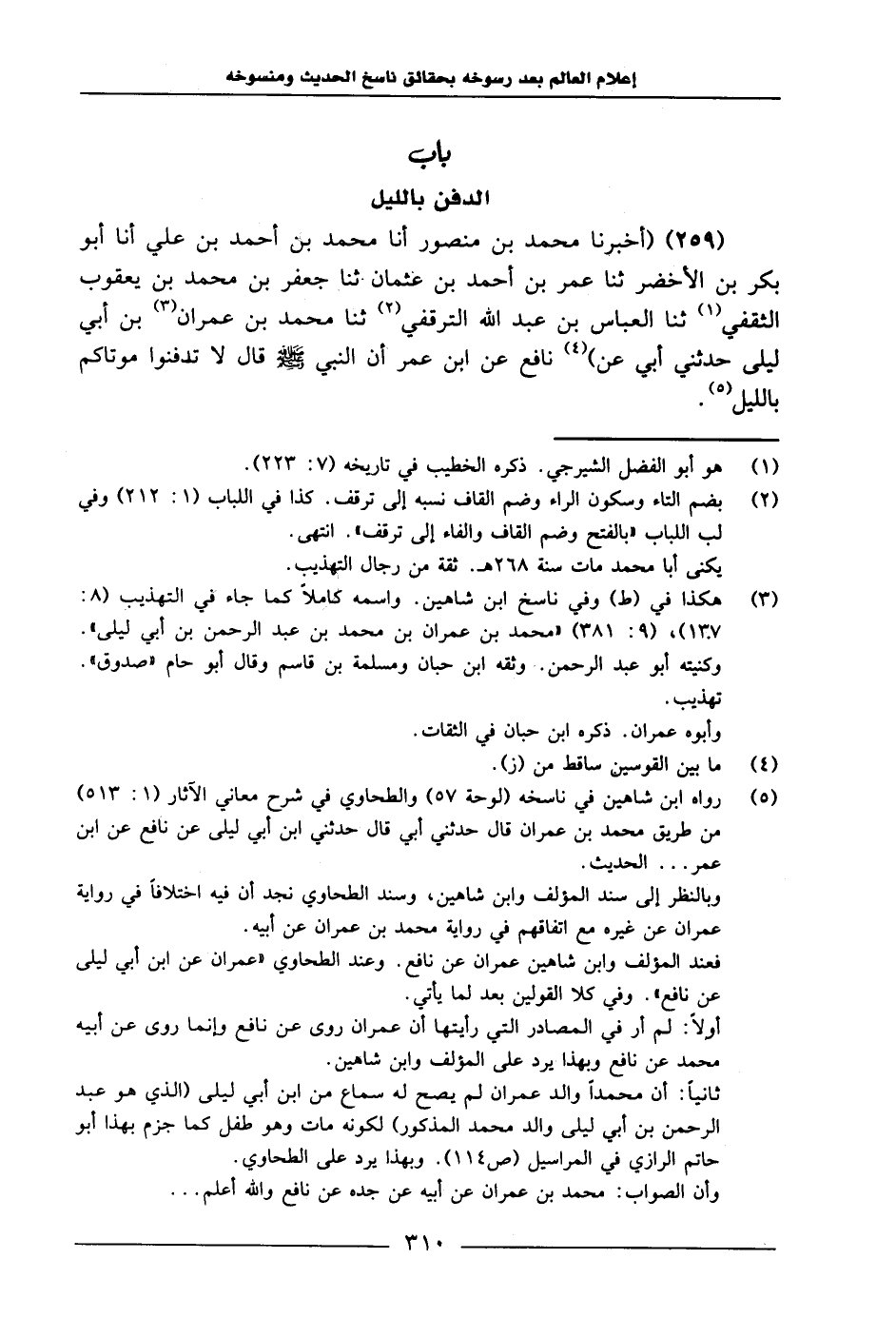 259 - أَخْبَرَنَا مُحَمَّدُ بْنُ مَنْصُورٍ، أَنَا مُحَمَّدُ بْنُ أَحْمَدَ بْنِ عَلِيٍّ، أَنَا أَبُو بَكْرِ بْنُ الْأَخْضَرِ، ثنا عُمَرُ بْنُ أَحْمَدَ، ثنا جَعْفَرُ بْنُ مُحَمَّدِ بْنِ يَعْقُوبَ الثَّقَفِيُّ، ثنا الْعَبَّاسُ بْنُ عَبْدِ اللَّهِ التَّرْقُفِيُّ، ثنا مُحَمَّدُ بْنُ عِمْرَانَ بْنِ أَبِي لَيْلَى، حَدَّثَنِي أَبِي، عَنْ نَافِعٍ، عَنِ ابْنِ عُمَرَ، أَنّ النَّبِيَّ صَلَّى اللَّهُ عَلَيْهِ وَسَلَّمَ، قَالَ: «لَا تَدْفِنُوا مَوْتَاكُمْ بِاللَّيْلِ» .