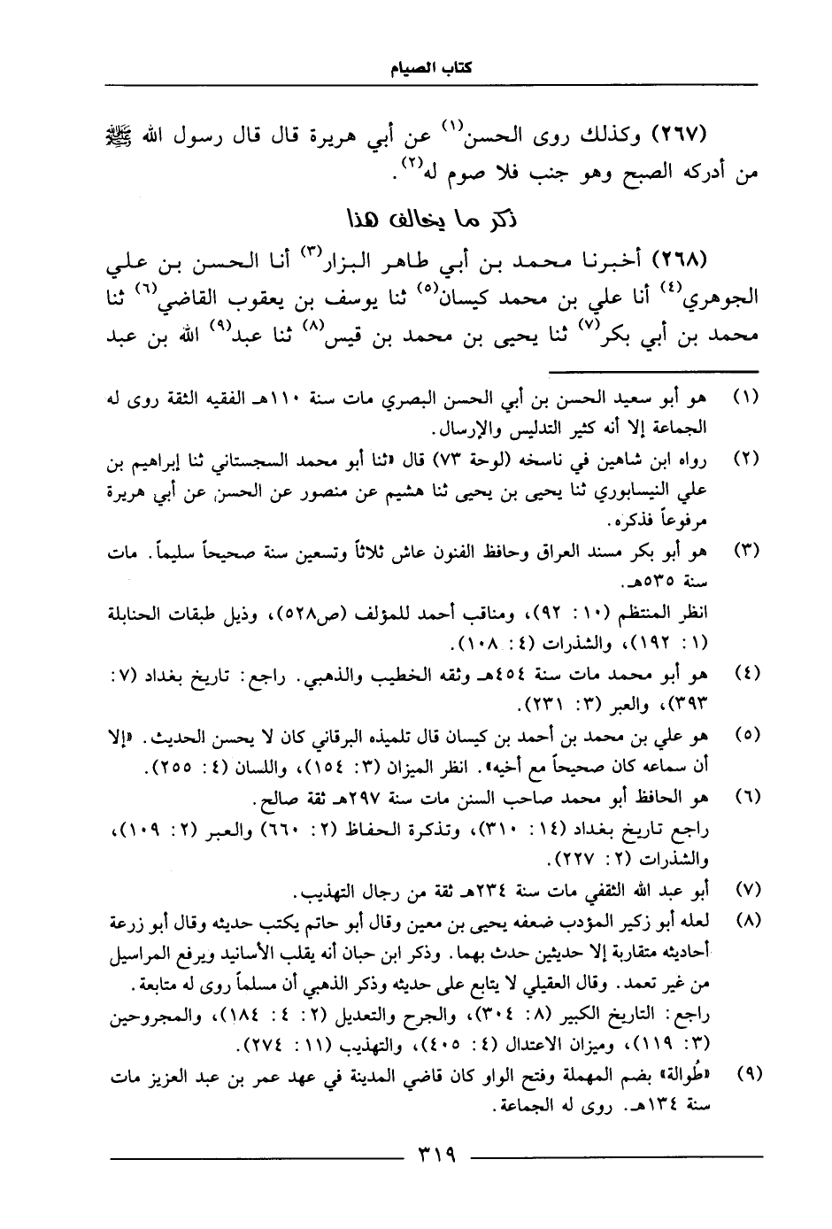 267 - وَكَذَلِكَ رَوَى الْحَسَنُ، عَنْ أَبِي هُرَيْرَةَ، قَالَ: قَالَ رَسُولُ اللَّهِ صَلَّى اللَّهُ عَلَيْهِ وَسَلَّمَ: «مَنْ أَدْرَكَهُ الصُّبْحُ، وَهُوَ جُنُبٌ، فَلَا صَوْمَ لَهُ»