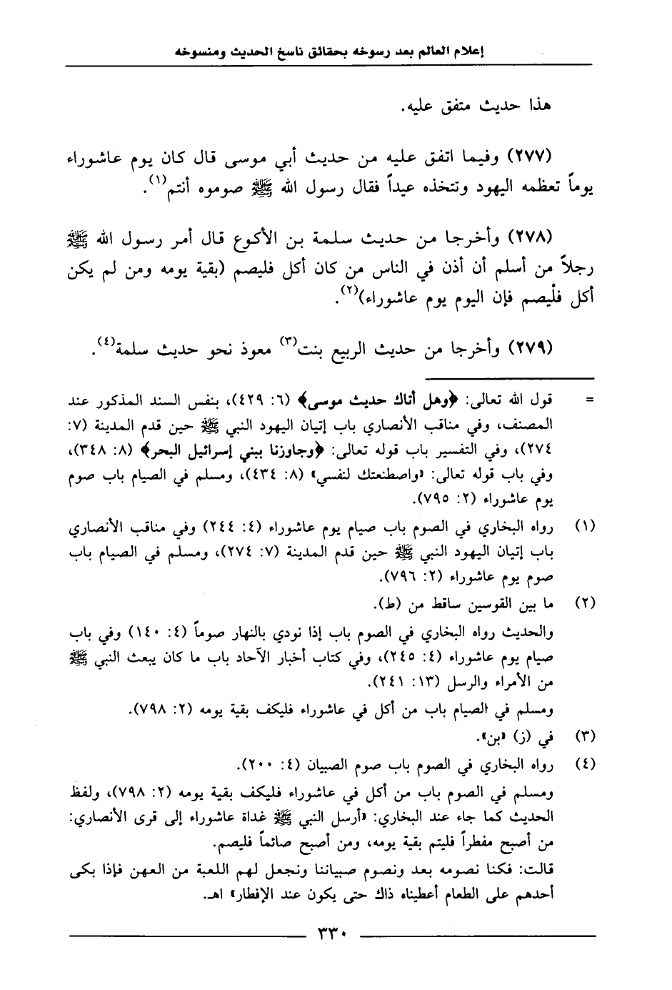 277 - وَفِيمَا اتُّفِقَ عَلَيْهِ مِنْ حَدِيثِ أَبِي مُوسَى، قَالَ: كَانَ يَوْمُ عَاشُورَاءَ يَوْمًا تُعَظِّمُهُ الْيَهُودُ، وَتَتَّخِذُهُ عِيدًا، فَقَالَ رَسُولُ اللَّهِ صَلَّى اللَّهُ عَلَيْهِ وَسَلَّمَ: «صُومُوهُ أَنْتُمْ» 268 278 - وَأَخْرَجَا مِنْ حَدِيثِ سَلَمَةَ بْنِ الْأَكْوَعِ، قَالَ: «أَمَرَ رَسُولُ اللَّهِ صَلَّى اللَّهُ عَلَيْهِ وَسَلَّمَ رَجُلًا مِنْ أَسْلَمَ أَنْ أَذِّنْ فِي النَّاسِ مَنْ كَانَ أَكَلَ فَلْيَصُمْ بَقِيَّةَ يَوْمِهِ، وَمَنْ لَمْ يَكُنْ أَكَلَ فَلْيَصُمْ، فَإِنَّ الْيَوْمَ يَوْمُ عَاشُورَاءَ» ،