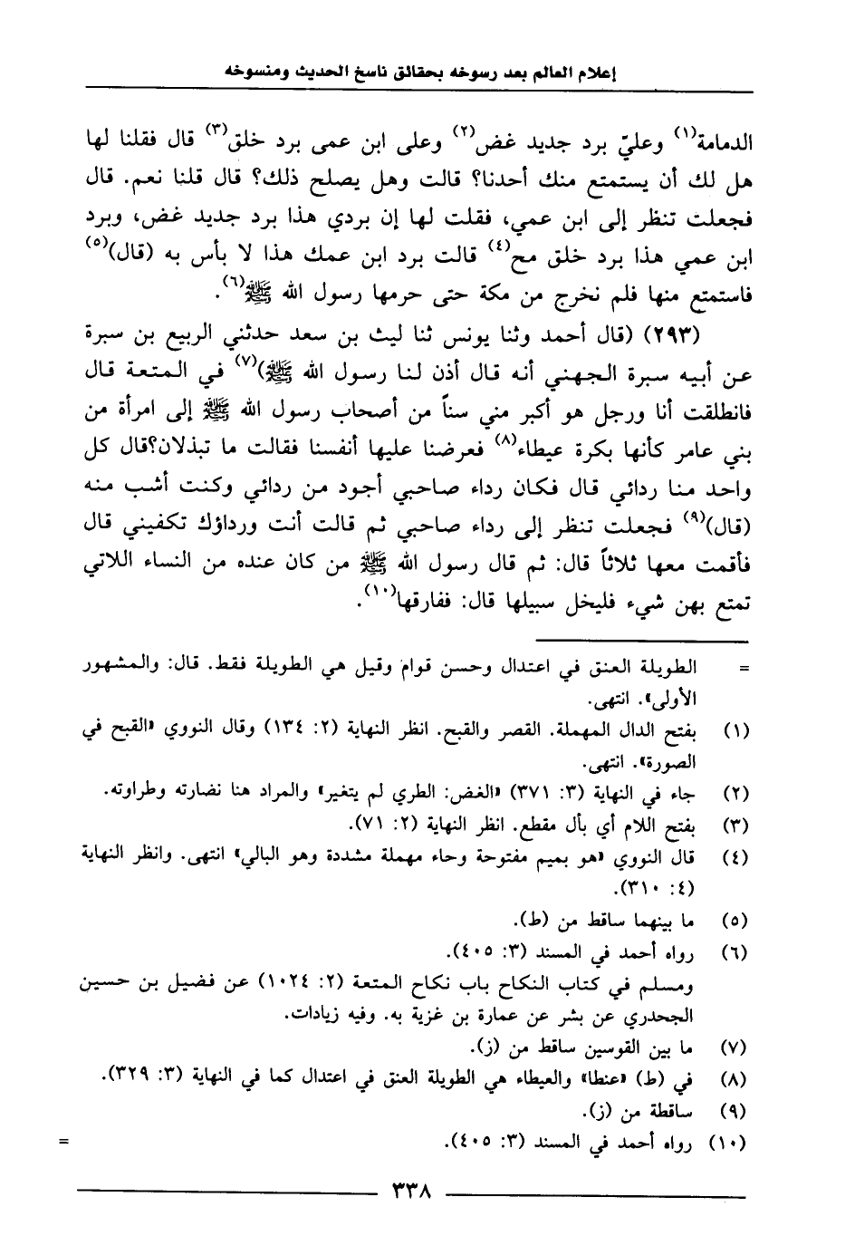 293 - قَالَ أَحْمَدُ: وَثَنَا يُونُسُ، ثنا لَيْثُ بْنُ سَعْدٍ، حَدَّثَنِي الرَّبِيعُ بْنُ سَبْرَةَ، عَنْ أَبِيهِ سَبْرَةَ الْجَهْنِيِّ، أَنَّهُ قَالَ: أَذَنَ لَنَا رَسُولُ اللَّهِ صَلَّى اللَّهُ عَلَيْهِ وَسَلَّمَ فِي الْمُتْعَةِ، قَالَ: فَانْطَلَقْتُ أَنَا وَرَجُلٌ هُوَ أَكْبَرُ مِنِّي سِنًّا مِنْ أَصْحَابِ رَسُولِ اللَّهِ صَلَّى اللَّهُ عَلَيْهِ وَسَلَّمَ إِلَى امْرَأَةٍ مِنْ بَنِي عَامِرٍ، كَأَنَّهَا بَكْرَةٌ عَيْطَاءٌ، فَعَرَضْنَا عَلَيْهَا أَنْفُسُنَا، فَقَالَتْ: مَا تَبْذُلَانِ؟ قَالَ: كُلُّ وَاحِدٍ مِنَّا رِدَائِي، قَالَ: فَكَانَ رِدَاءُ صَاحِبي أَجْوَدَ مِنْ رِدَائِي، وَكُنْتُ أَشَبَّ مِنْهُ، قَالَ: فَجَعَلَتْ تَنْظُرُ إِلَى رِدَاءِ صَاحِبي، ثُمَّ قَالَتْ: أَنْتَ وَرِدَاؤُكَ تَكْفِينِي، قَالَ: فَأَقَمْتُ مَعَهَا ثَلَاثًا، قَالَ: ثُمَّ قَالَ رَسُولُ اللَّهِ صَلَّى اللَّهُ عَلَيْهِ وَسَلَّمَ: «مَنْ كَانَ عِنْدَهُ مِنَ النِّسَاءِ اللَّاتِي تَمَتَّعَ بِهِنَّ شَيْءٍ، فَلْيَخْلِ سَبِيلَهَا» ، قَالَ: فَفَارَقَهَا