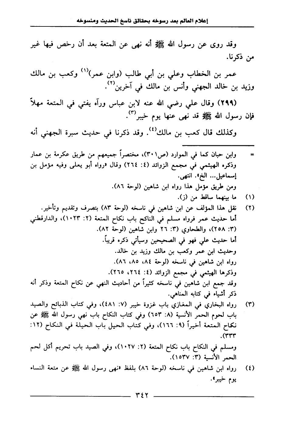 299 - وَقَالَ عَلِيٌّ رَضِيَ اللَّهُ عَنْهُ لِابْنِ عَبَّاسٍ، وَرَآهُ يُفْتِي فِي الْمُتْعَةِ «مَهْلًا، فَإِنَّ رَسُولَ اللَّهِ صَلَّى اللَّهُ عَلَيْهِ وَسَلَّمَ قَدْ نَهَى عَنْهَا يَوْمَ خَبْيَرَ» .