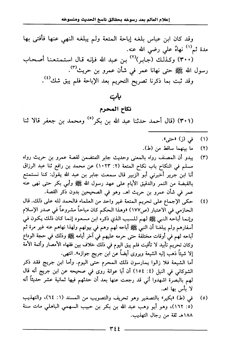 وَقَدْ كَانَ ابْنُ عَبَّاسٍ بَلَغَهُ إِبَاحَةُ الْمُتْعَةِ، وَلَمْ يَبْلُغْهُ النَّهْيُ عَنْهَا، فَأَفْتَى بِهَا مُدَّةً، ثُمَّ نَهَاهُ عَلِيٌّ رَضِيَ اللَّهُ عَنْهُ 289 300 - وَكَذَلِكَ جَابِرُ بْنُ عَبْدِ اللَّهِ، فَإِنَّهُ قَالَ: «اسْتَمْتَعْنَا أَصْحَابُ رَسُولِ اللَّهِ صَلَّى اللَّهُ عَلَيْهِ وَسَلَّمَ حَتَّى نَهَانَا عُمَرُ فِي شَأْنِ عَمْرِو بْنِ حُرَيْثٍ» .