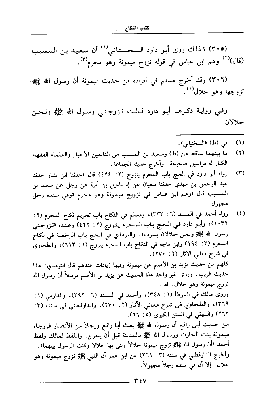 305 - كَذَلِكَ رَوَى أَبُو دَاوُدَ السِّجِسْتَانِيُّ، أَنَّ سَعِيدَ بْنَ الْمُسَيِّبِ، قَالَ: وَهِمَ ابْنُ عَبَّاسٍ، فِي قَوْلِهِ «تَزَوَّجَ مَيْمُونَةَ وَهُوَ مُحْرِمٌ» 295 306 - وَقَدْ أَخْرَجَ مُسْلِمٌ فِي أَفْرَادِهِ مِنْ حَدِيثِ مَيْمِونَةَ: «أَنَّ رَسُولَ اللَّهِ صَلَّى اللَّهُ عَلَيْهِ وَسَلَّمَ تَزَوَّجَهَا، وَهُوَ حَلَالٌ» .