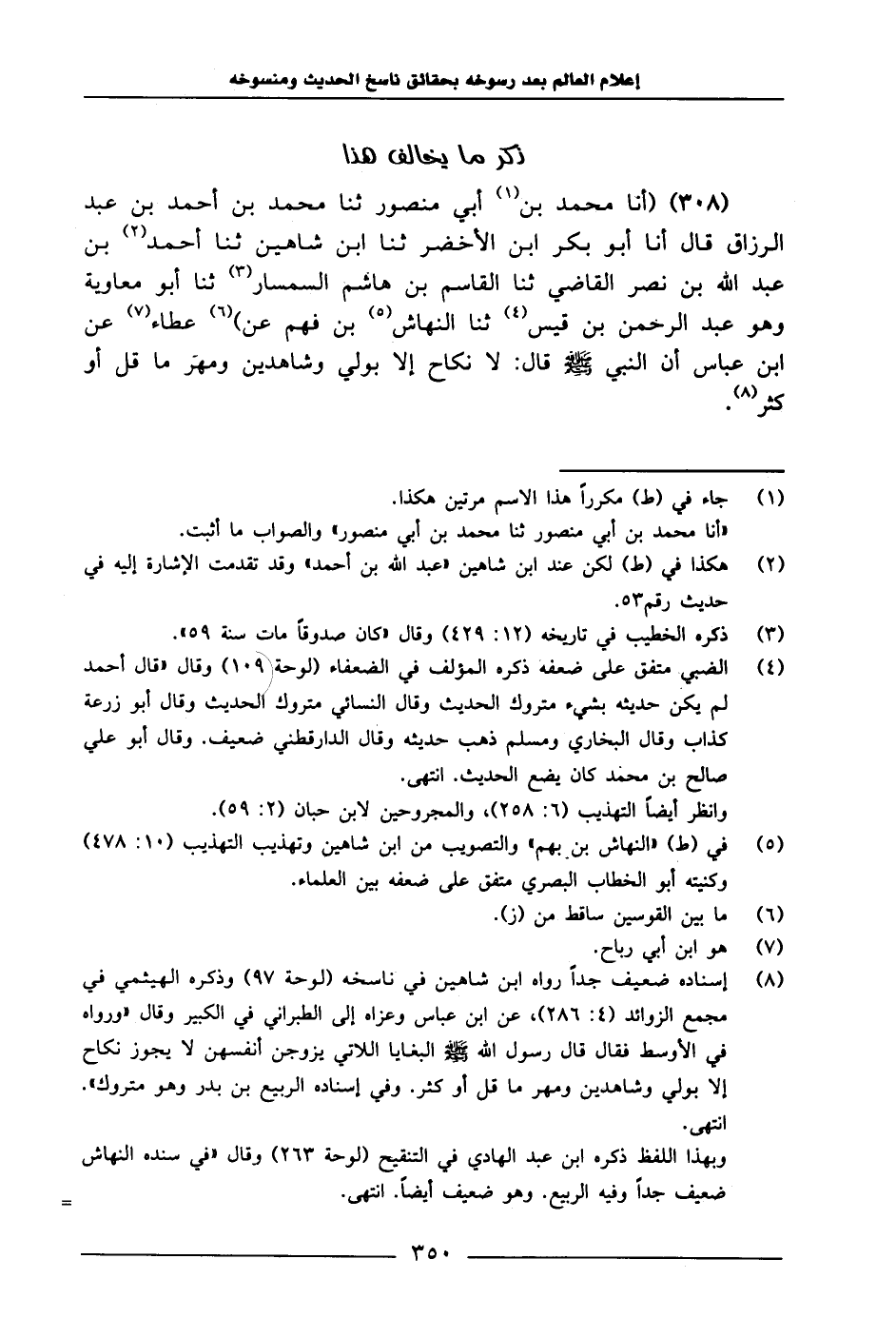 308 - أَنَا مُحَمَّدُ بْنُ أَبِي مَنْصُورٍ، ثنا مُحَمَّدُ بْنُ أَحْمَدَ بْنِ عَبْدِ الرَّزَّاقِ، قَالَ: أَنَا أَبُو بَكْرِ بْنِ الْأَخْضَرِ، ثنا ابْنُ شَاهِينَ، ثنا أَحْمَدُ بْنُ عَبْدِ اللَّهِ بْنِ نَصْرٍ الْقَاضِي، ثنا الْقَاسِمُ بْنُ هَاشِمٍ السِّمْسَارُ ثنا أَبُو مُعَاوِيَةَ , وَهُوَ عَبْدُ الرَّحْمَنِ بْنُ قَيْسٍ، ثنا النَّهَّاسُ بْنُ قَهْمٍ، عَنْ عَطَاءٍ، عَنِ ابْنِ عَبَّاس، أَنّ النَّبِيَّ صَلَّى اللَّهُ عَلَيْهِ وَسَلَّمَ، قَالَ: «لَا نِكَاحَ إِلَّا بِوَلِيٍ، وَشَاهِدَيْنِ، وَمَهْرٍ، مَا قَلَّ أَوْ كَثُرَ» .