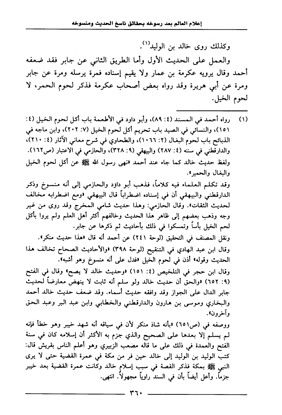 وَالْعَمَلُ عَلَى الْحَدِيثِ الْأَوَّلِ، وَأَمَّا الطَّرِيقُ الثَّانِي، عَنْ جَابِرٍ فَقَدْ ضَعَّفَهُ أَحْمَدُ، وَقَالَ: يَرْوِيهِ عِكْرِمَةُ بْنُ عَمَّارٍ، وَلَا يُقِيمُ إِسْنَادَهَ، فَمَرَّةً يُرْسِلَهُ، وَمَرَّةً عَنْ جَابِرٍ، وَمَرَّةً عَنْ أَبِي هُرَيْرَةَ، وَقَدْ رَوَاهُ بَعْضُ أَصْحَابِ عِكْرِمَةَ، فَذَكَرَ لُحُومَ الْحُمْرِ، لَا لُحُومَ الْخَيْلِ.
