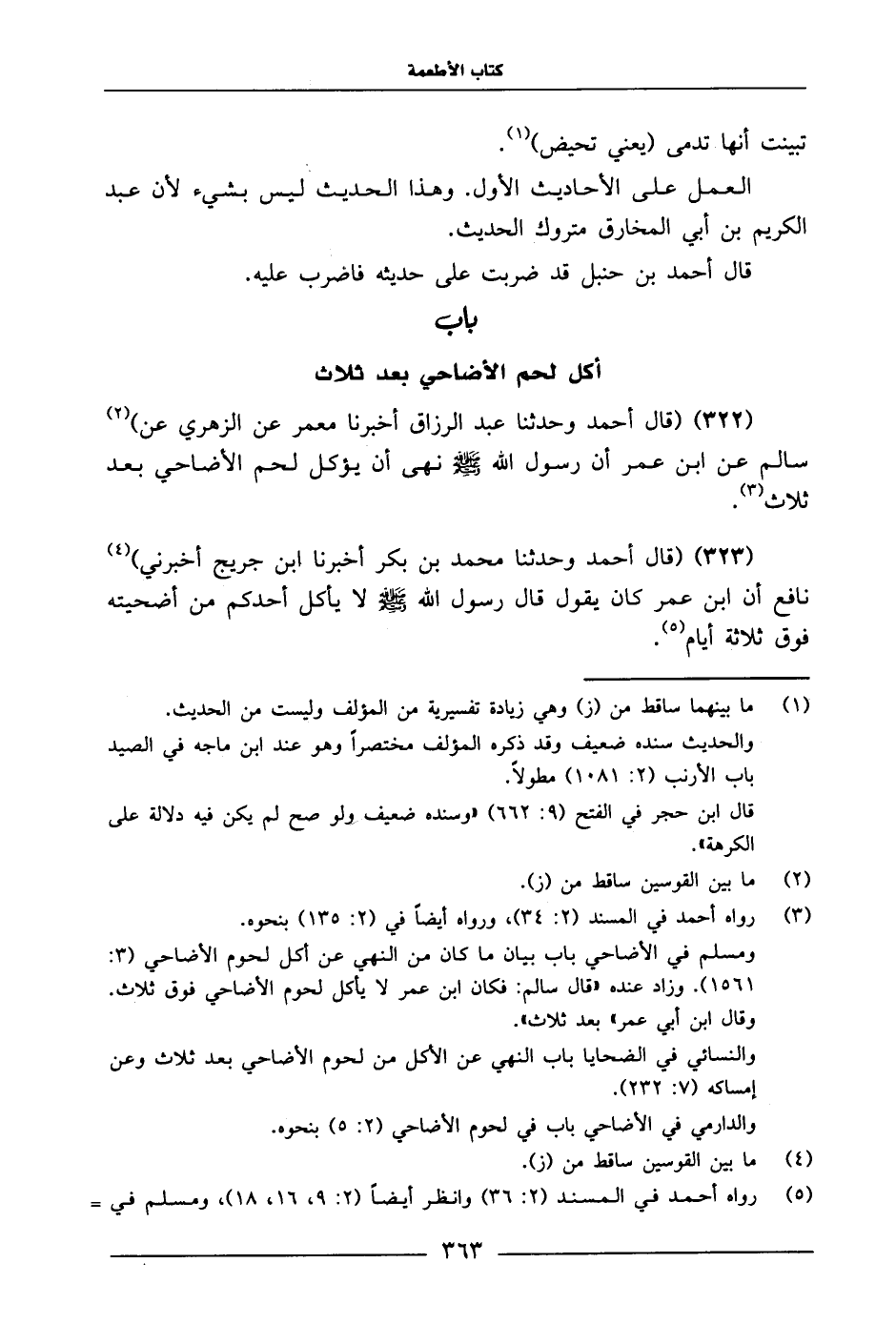 322 - قَالَ أَحْمَدُ وَحَدَّثَنَا عَبْدُ الرَّزَّاقِ، أَخْبَرَنَا مَعْمَرٌ، عَنِ الزُّهْرِيِّ، عَنْ سَالِمٍ، عَنِ ابْنِ عُمَرَ «أَنَّ رَسُولَ اللَّهِ صَلَّى اللَّهُ عَلَيْهِ وَسَلَّمَ نَهَى أَنْ يُؤْكَلَ لَحْمُ الْأَضَاحِي بَعْدَ ثَلَاثٍ»