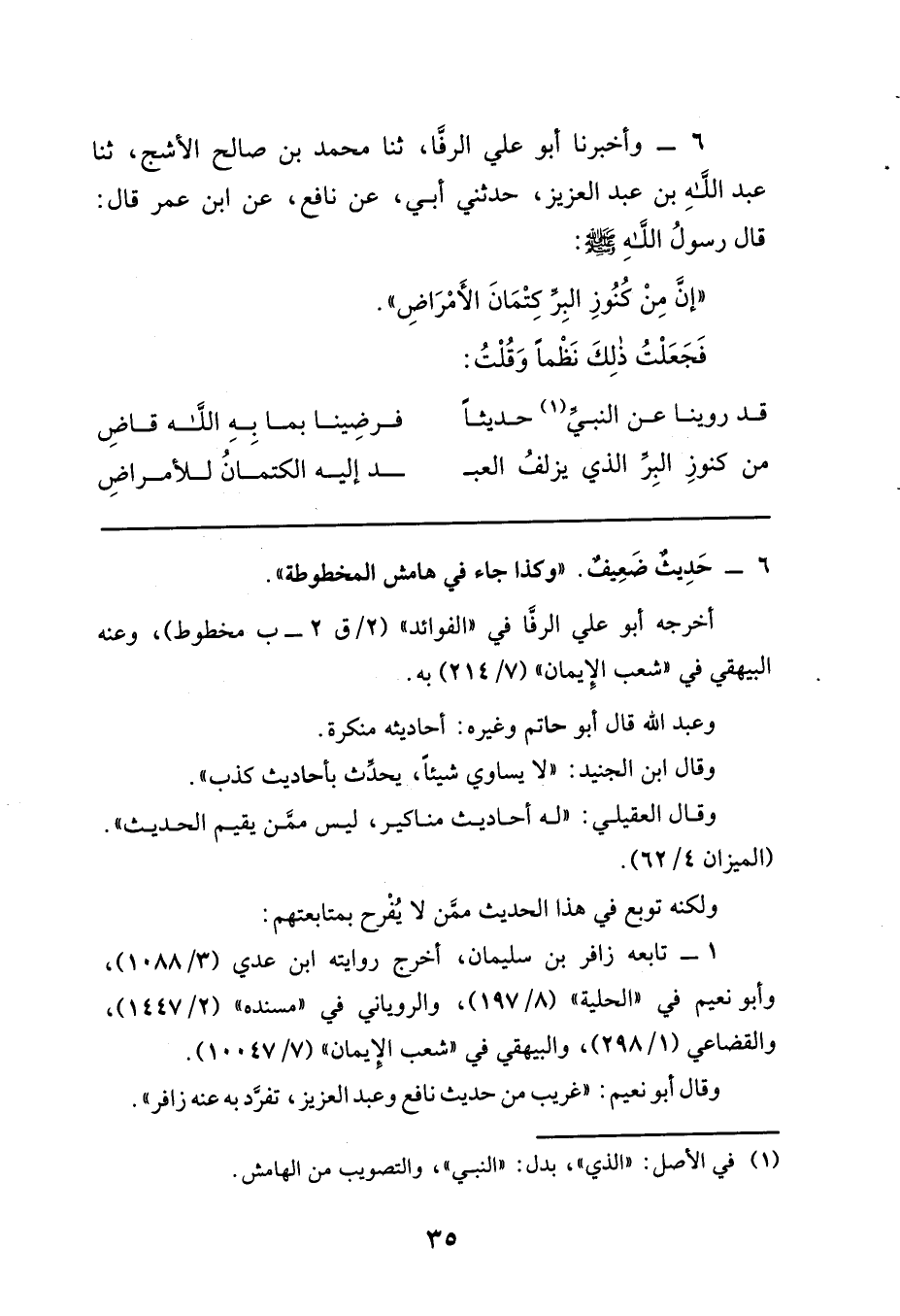 ((إِنَّ مِنْ كُنُوزِ الْبِرِّ كِتْمَانُ الأَمْرَاضَ)) .