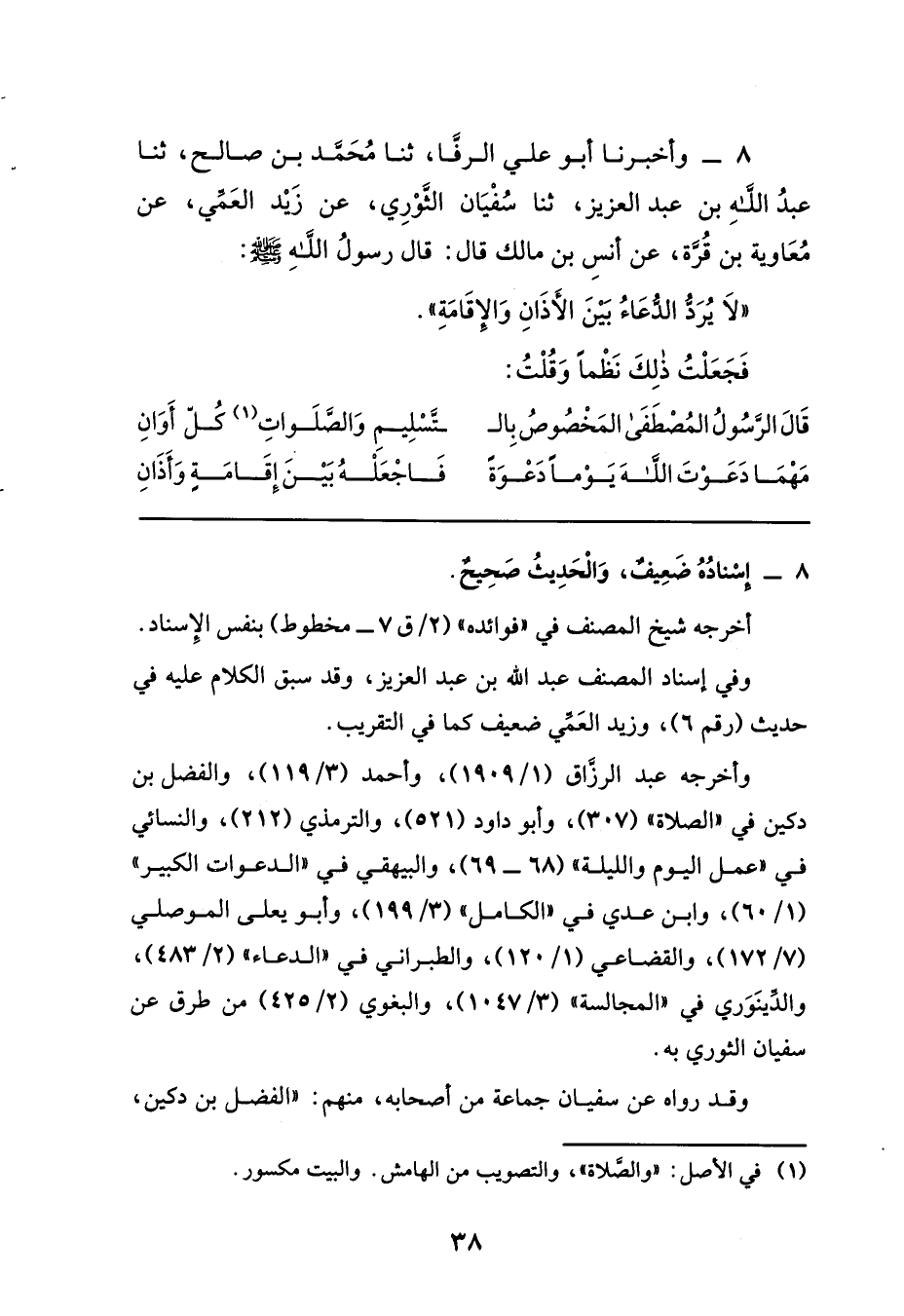 8- وأخبرنا أبو علي الرفا، ثنا مُحَمَّدُ بْنُ صَالِحٍ، ثنا عَبْدُ اللَّهِ بْنُ عَبْدِ الْعَزِيزِ، ثنا سُفْيَانُ الثَّوْرِيُّ، عَنْ زَيْدٍ الْعَمِيِّ، عَنْ مُعَاوِيَةَ بْنِ قُرَّةَ، عَنْ أَنَسِ بْنِ مَالِكٍ قَالَ: قَالَ رَسُولُ اللَّهِ صَلَّى اللَّهُ عَلَيْهِ وَسَلَّمَ: