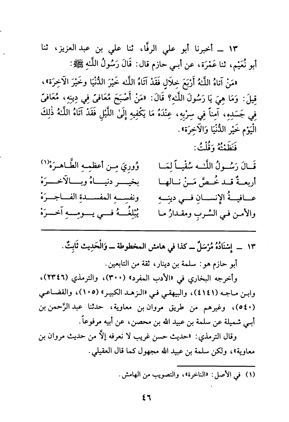 ((مَنْ أَتَاهُ اللَّهُ أَرْبَعَ خلالٍ فَقَدْ أَتَاهُ اللَّهُ خَيْرَ الدُّنْيَا وَخَيْرَ الآخِرَةِ)) ، قِيلَ: وَمَا هِيَ يَا رَسُولُ اللَّهِ؟ قَالَ: ((مَنْ أَصْبَحَ مُعَافًى فِي دِينِهِ، مُعَافًى فِي جَسَدِهِ، آمِنًا فِي سِرْبِهِ، عِنْدَهُ مَا يَكْفِيهِ إِلَى اللَّيْلِ فَقَدْ أَتَاهُ اللَّهُ ذَلِكَ الْيَوْمَ خَيْرُ الدُّنْيَا وَالآخِرَةِ)) .